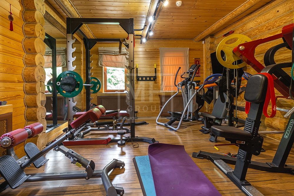 Этаж 1: Входная группа, кухня, столовая с камином, гостинная, спальня с выходом на террасу, санузел, постирочная, спортзал с тренажерами, котельная, гардеробная.