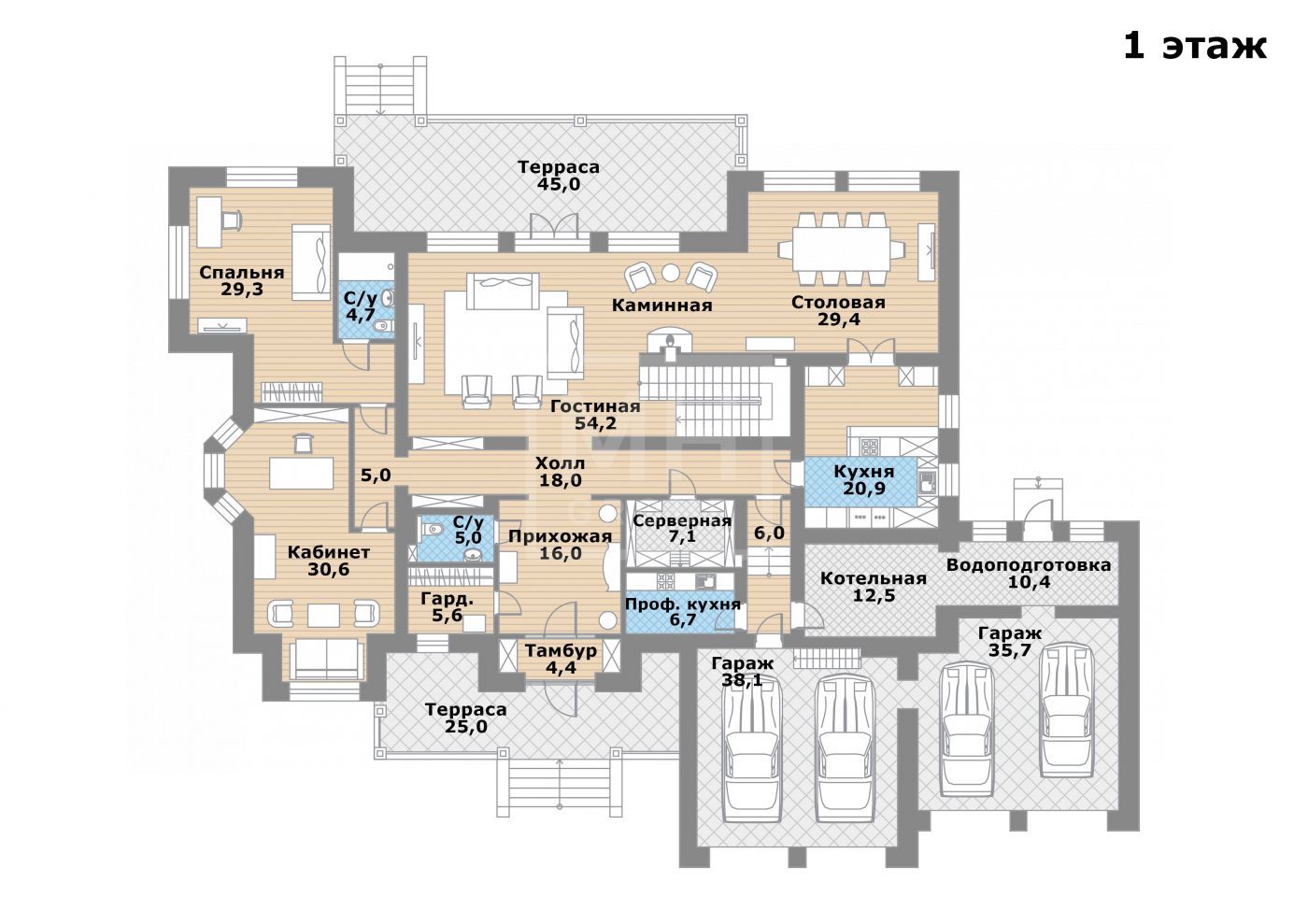 Этаж 1: Входная группа, гардеробная, гостевой санузел, гостиная с выходом на террасу, каминная-столовая, парадная кухня, техническая кухня, кабинет, спальня со своим санузлом, котельная, серверная.