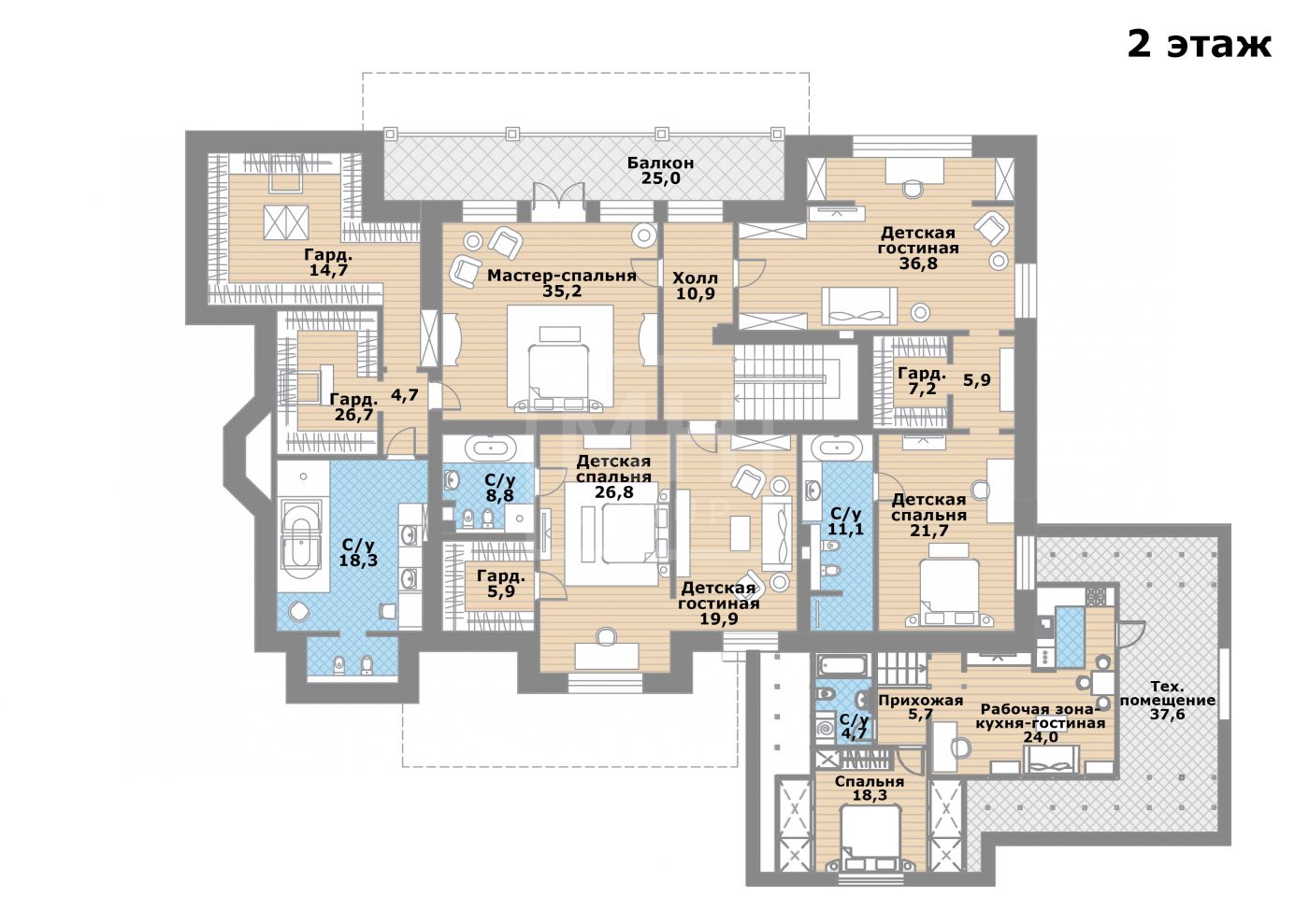 Этаж 2: Мастер блок: спальня с выходом на балкон, ванная комната, 2 гардеробные. Спальня с игровой, ванной комнатой, гардеробной.Спальня с рабочей зоной, гардеробной, санузлом. Блок для персонала: спальня, кухня-гостиная, техническое помещение.
