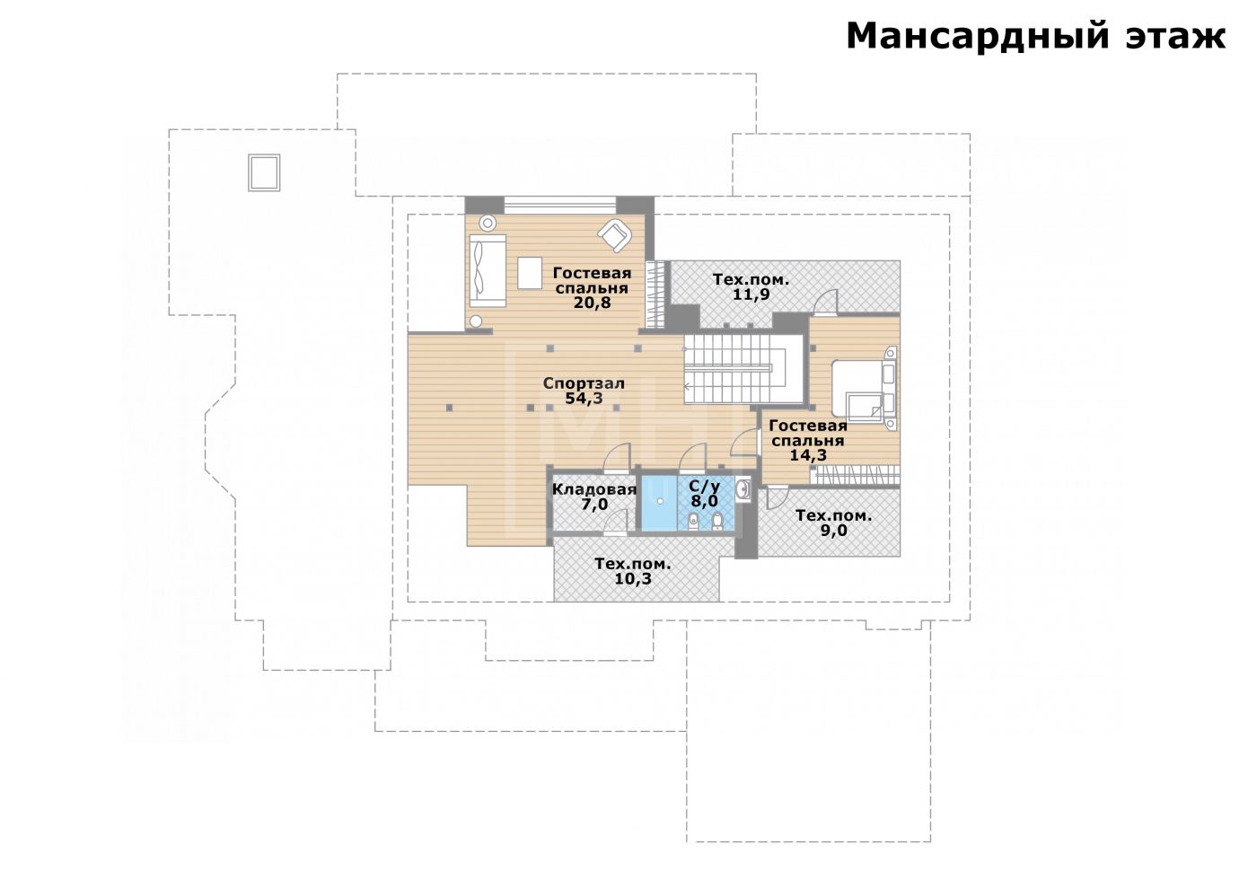 Мансарда: Гостевая спальня, зона отдыха, помещение свободного назначения, хобби-комната, санузел, техническое помещение.