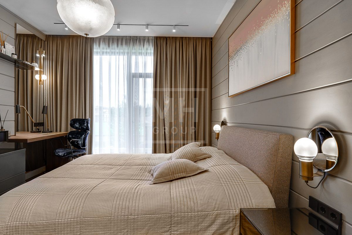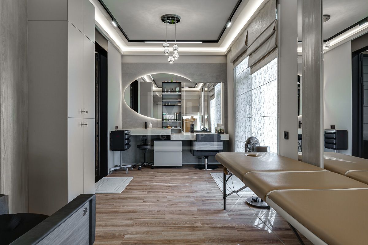 Этаж 2: холл, мастер - спальня с санузлом и гардеробной, балкон - 2 шт., детская спальня - 2 шт., комната отдыха, хаммам, массажный кабинет, тренажерный зал.
