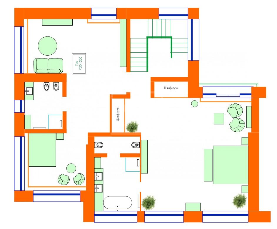 Этаж 2: спальня с с/у, спальня, гостиная, с/у