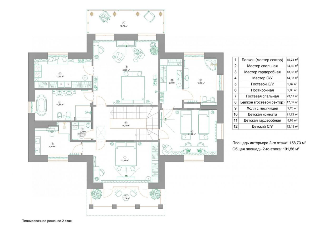 Этаж 2: Мастер спальня с ванной комнатой и гардеробной, спальня с санузлом, детская комната с санузлом и гардеробной, постирочная.
