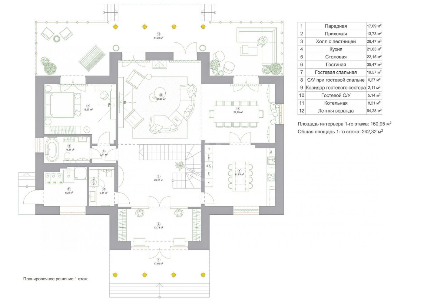 Этаж 1: Входная группа, холл с лестницей, кухня, столовая, гостиная с выходом на террасу, гостевая спальня с санузлом, санузел, котельная.