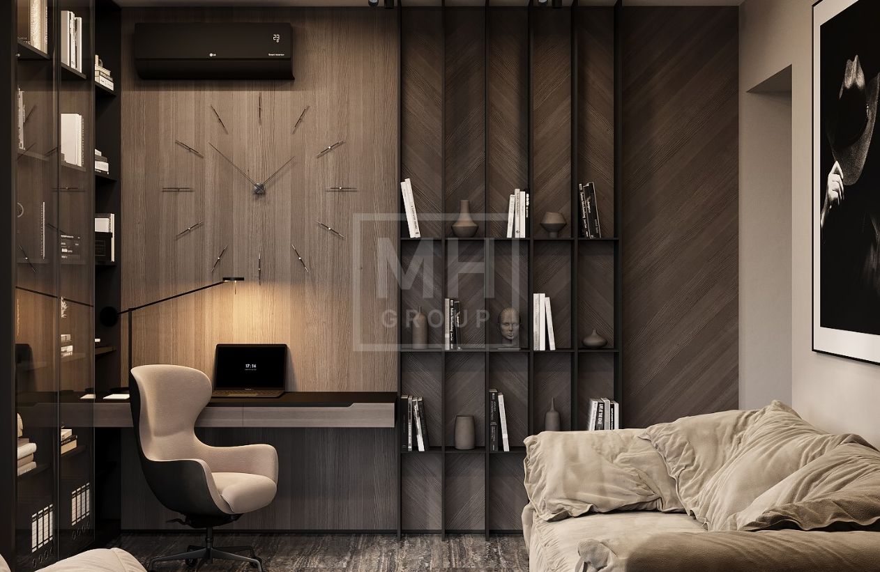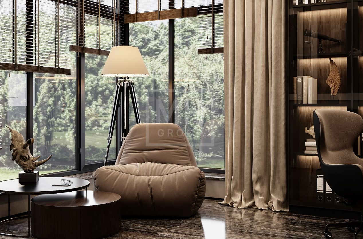Этаж 1: Прихожая, гардеробная, с/у, кабинет, кухня-столовая, гостиная, котельная