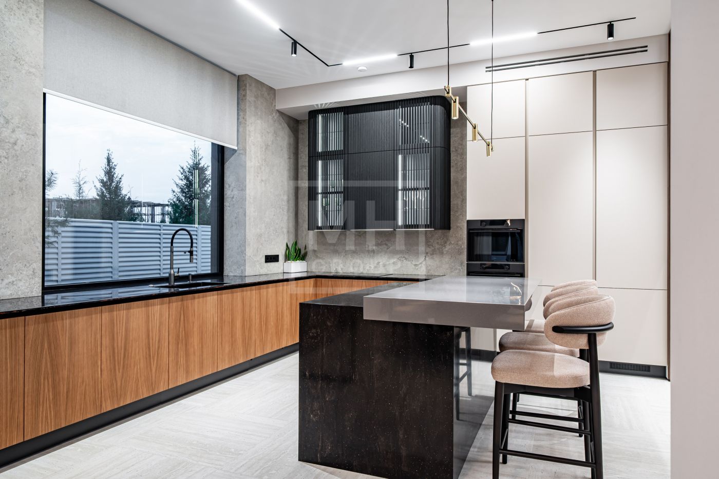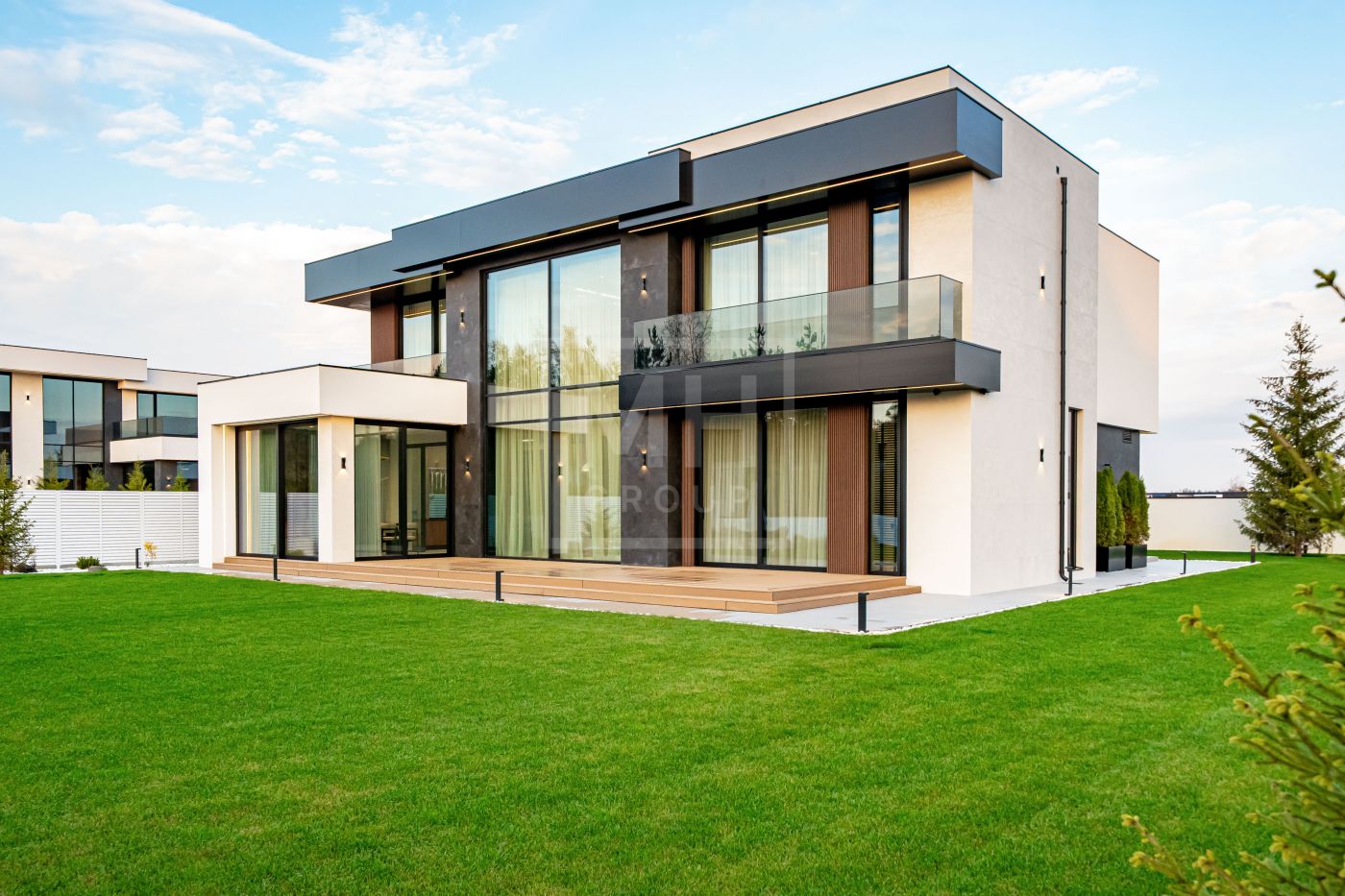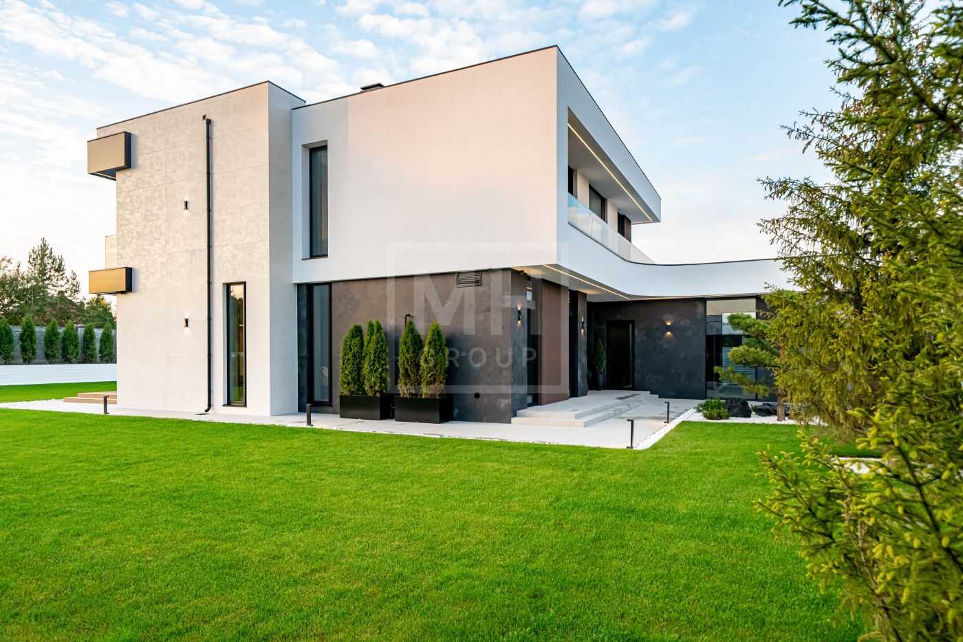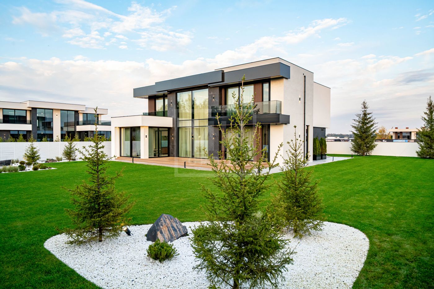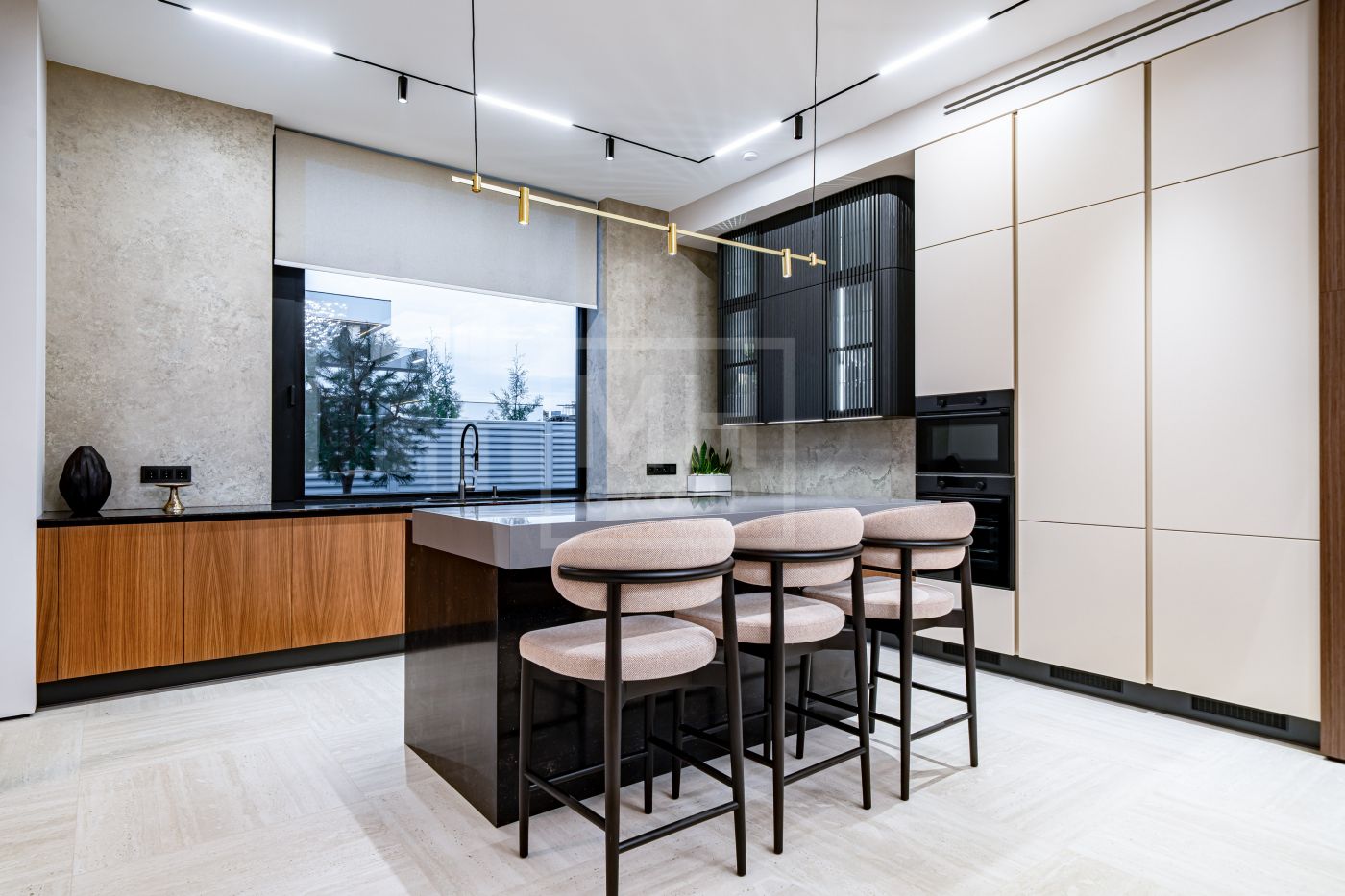 Все дома в поселке построены в едином стиле по мотивам архитектурных проектов Ф.Л. Райта. В строительстве и отделке использовались современные материалы. Для остекления были выбраны премиальные окна Schuco. На первом этаже располагается большая кухня гостиная со вторым светом, мастер спальня с гардеробной и своим санузлом, большой гараж на два машиноместа и большой навес на две машины. На втором этаже мастер спальня с гардеробной и ванной комнатой, две спальни со своими гардеробными и большой ванной комнатой. Дом очень нежный и светлый, цветовая гамма подобрана с учетом всех современных тенденция включая отделку, мебель и предметы интерьера.