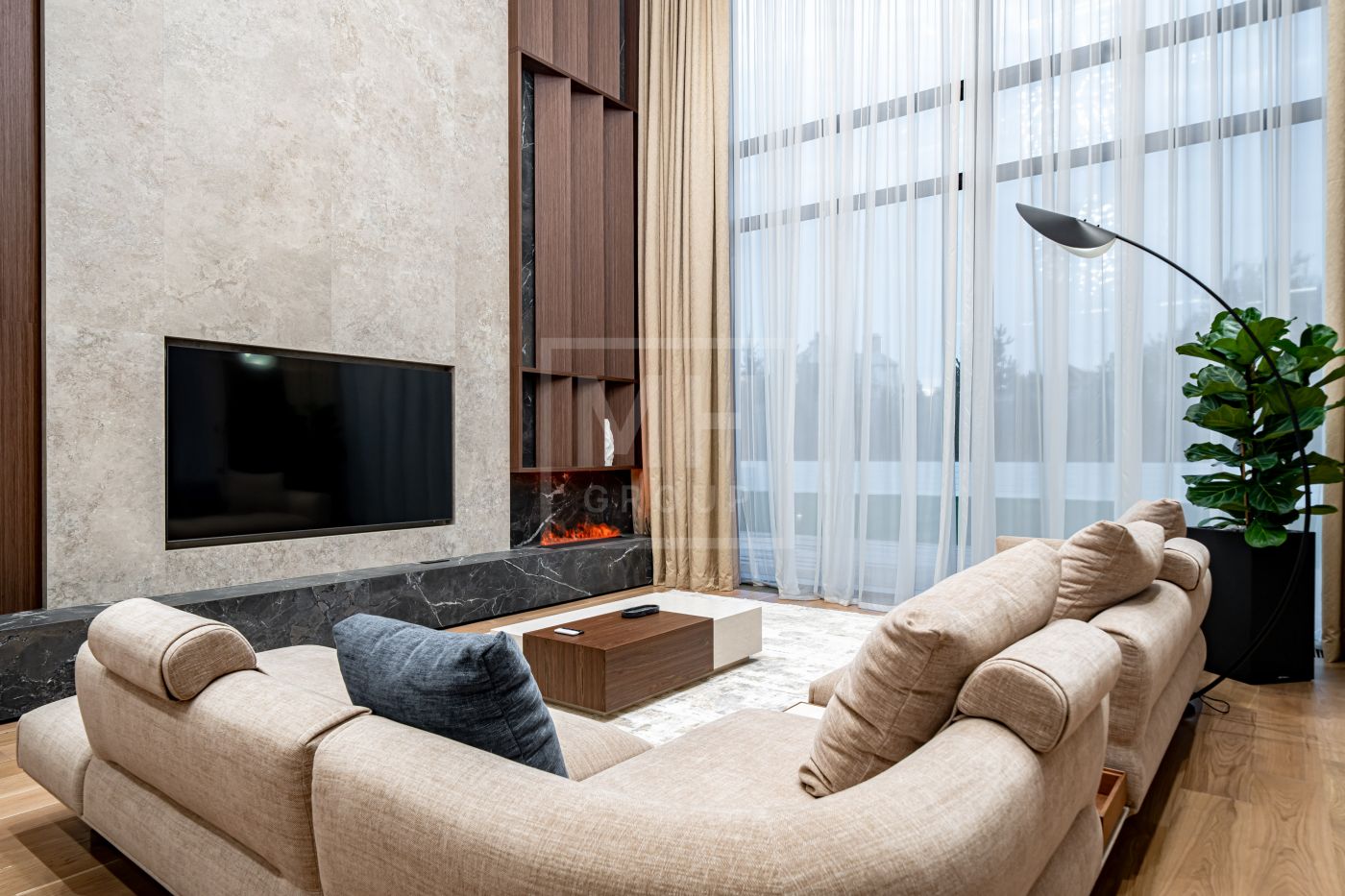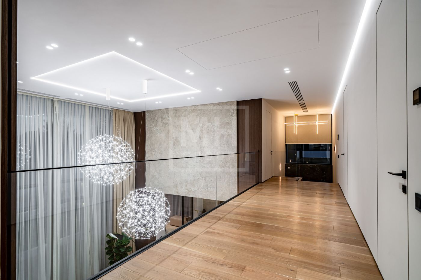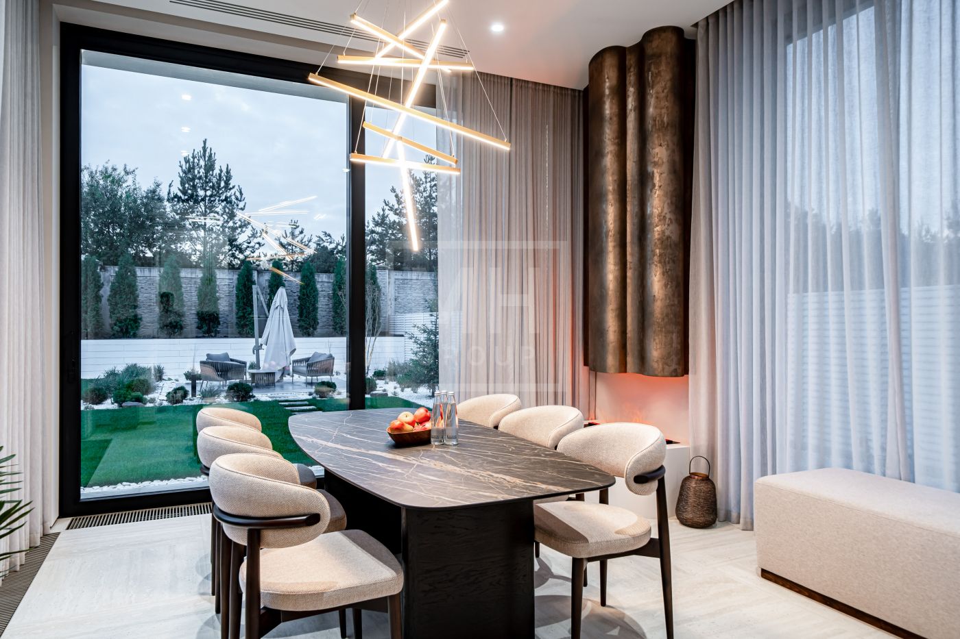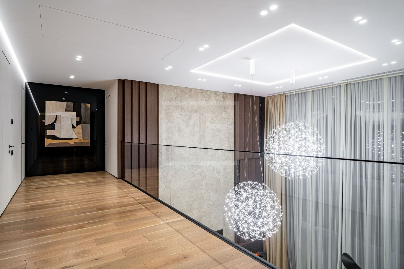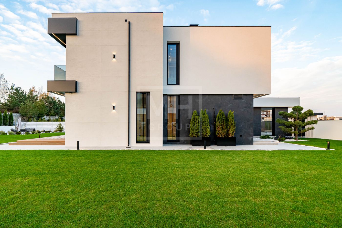 Все дома в поселке построены в едином стиле по мотивам архитектурных проектов Ф.Л. Райта. В строительстве и отделке использовались современные материалы. Для остекления были выбраны премиальные окна Schuco. На первом этаже располагается большая кухня гостиная со вторым светом, мастер спальня с гардеробной и своим санузлом, большой гараж на два машиноместа и большой навес на две машины. На втором этаже мастер спальня с гардеробной и ванной комнатой, две спальни со своими гардеробными и большой ванной комнатой. Дом очень нежный и светлый, цветовая гамма подобрана с учетом всех современных тенденция включая отделку, мебель и предметы интерьера.
