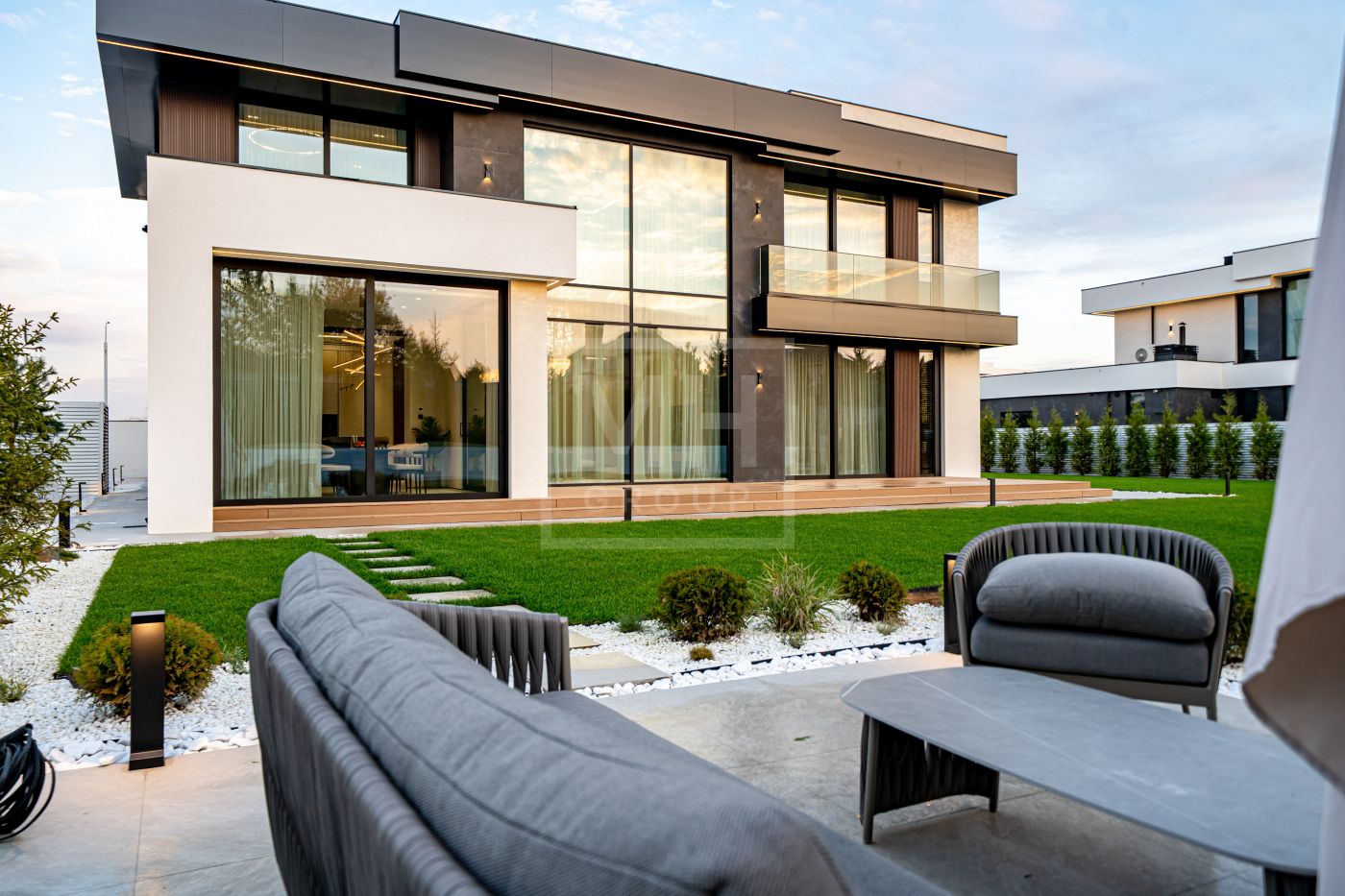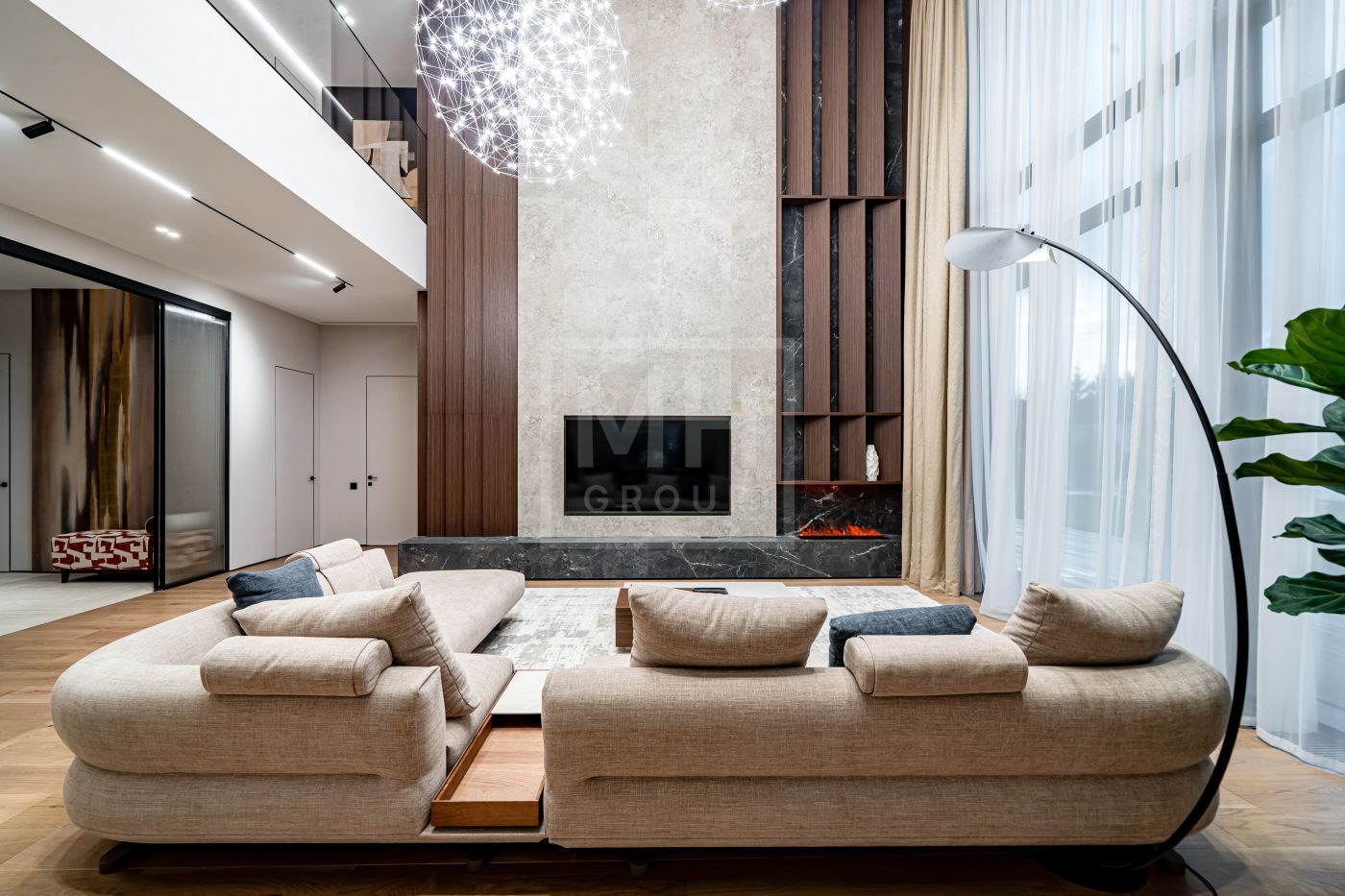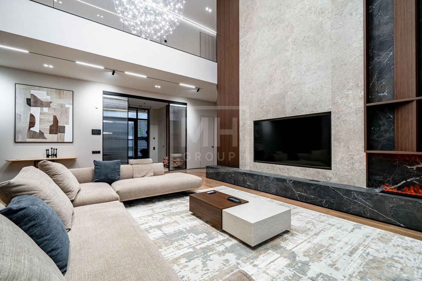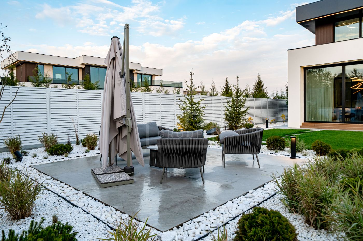 Все дома в поселке построены в едином стиле по мотивам архитектурных проектов Ф.Л. Райта. В строительстве и отделке использовались современные материалы. Для остекления были выбраны премиальные окна Schuco. На первом этаже располагается большая кухня гостиная со вторым светом, мастер спальня с гардеробной и своим санузлом, большой гараж на два машиноместа и большой навес на две машины. На втором этаже мастер спальня с гардеробной и ванной комнатой, две спальни со своими гардеробными и большой ванной комнатой. Дом очень нежный и светлый, цветовая гамма подобрана с учетом всех современных тенденция включая отделку, мебель и предметы интерьера.
