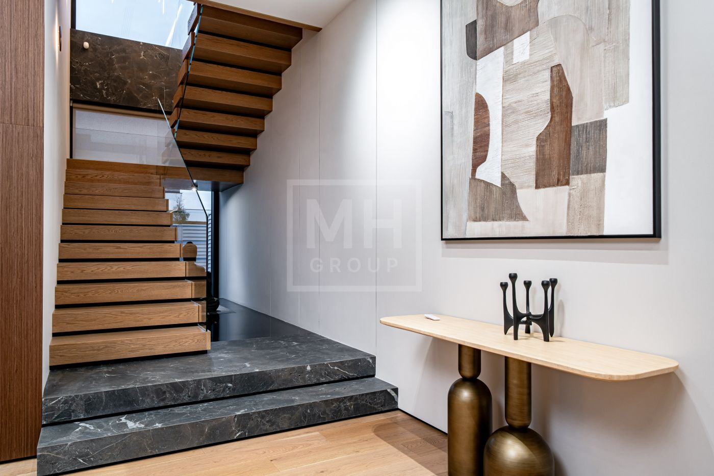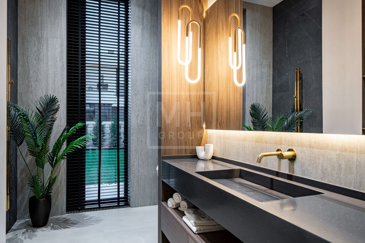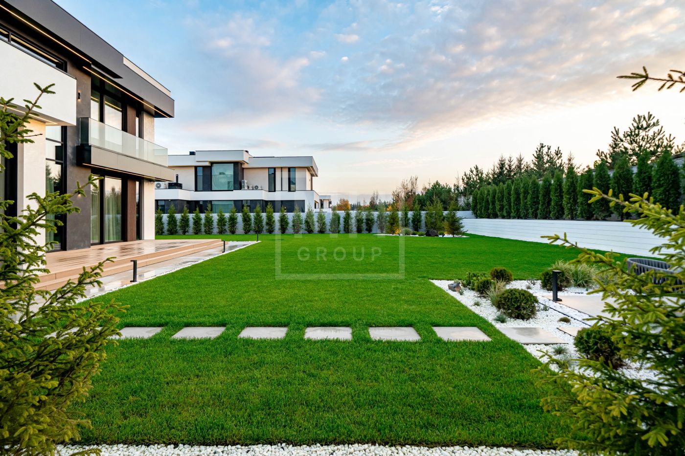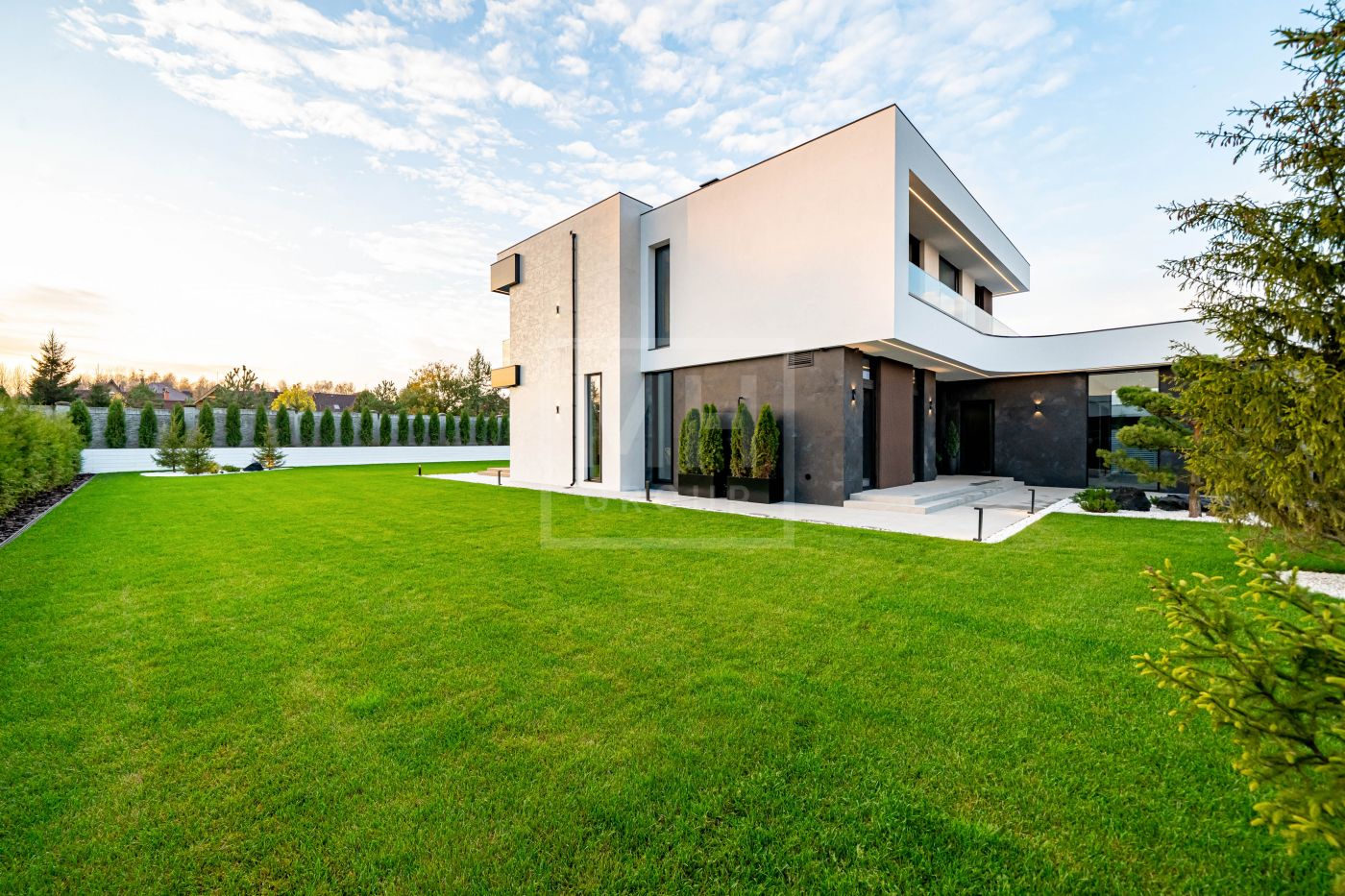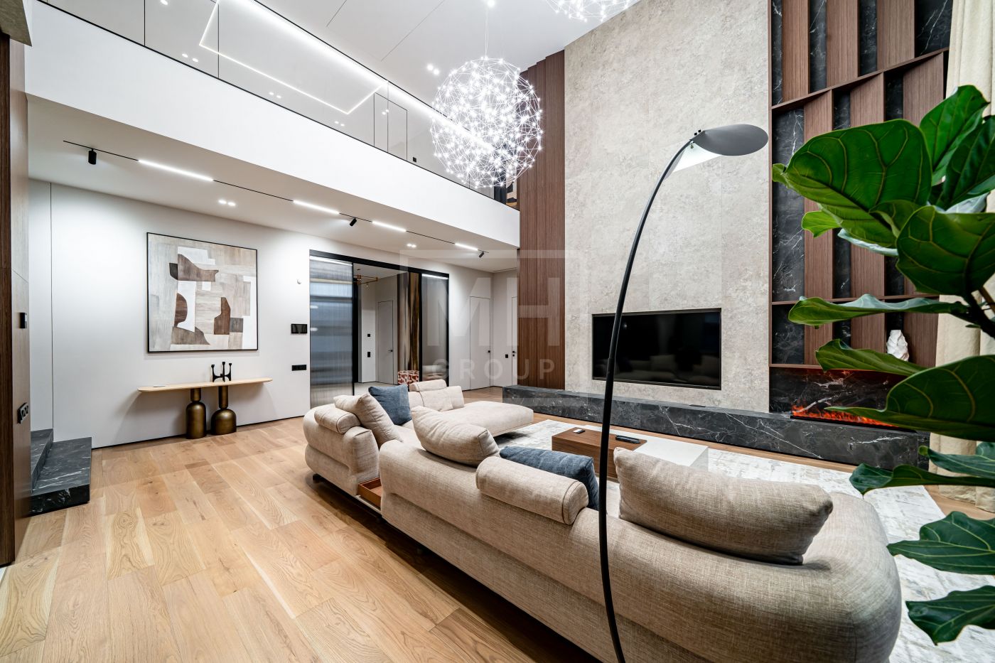 Все дома в поселке построены в едином стиле по мотивам архитектурных проектов Ф.Л. Райта. В строительстве и отделке использовались современные материалы. Для остекления были выбраны премиальные окна Schuco. На первом этаже располагается большая кухня гостиная со вторым светом, мастер спальня с гардеробной и своим санузлом, большой гараж на два машиноместа и большой навес на две машины. На втором этаже мастер спальня с гардеробной и ванной комнатой, две спальни со своими гардеробными и большой ванной комнатой. Дом очень нежный и светлый, цветовая гамма подобрана с учетом всех современных тенденция включая отделку, мебель и предметы интерьера.