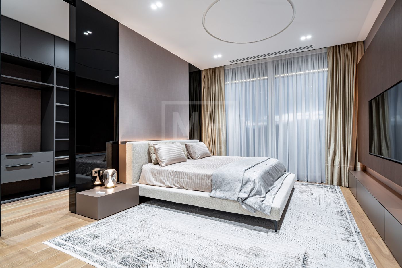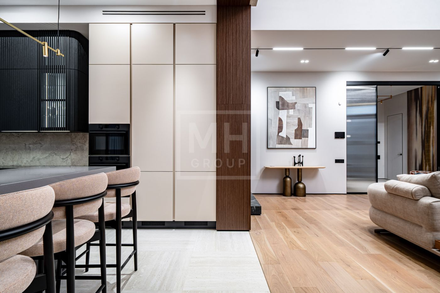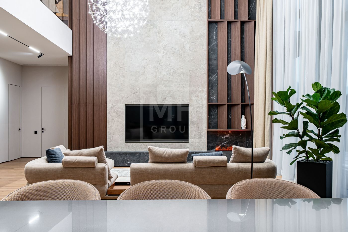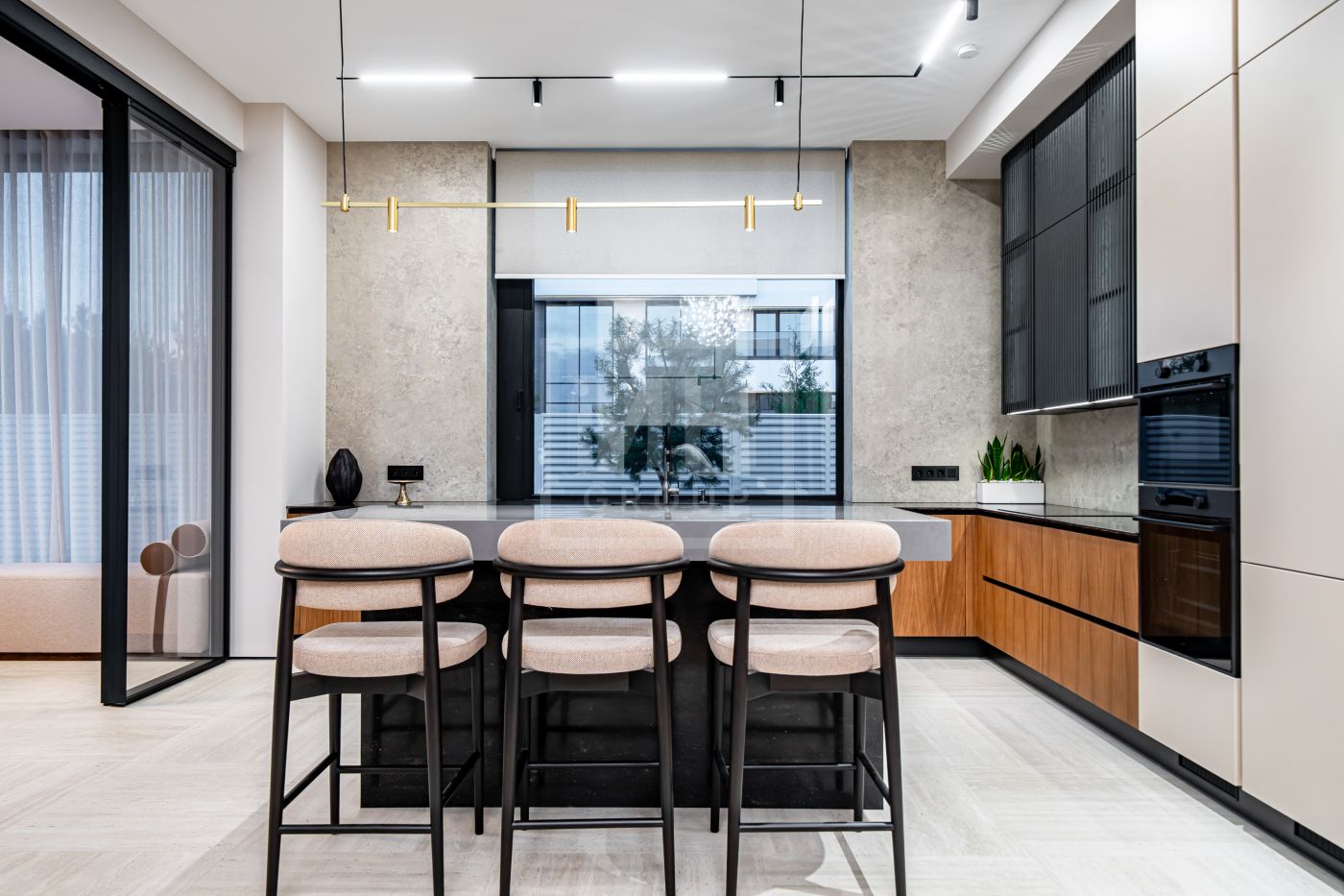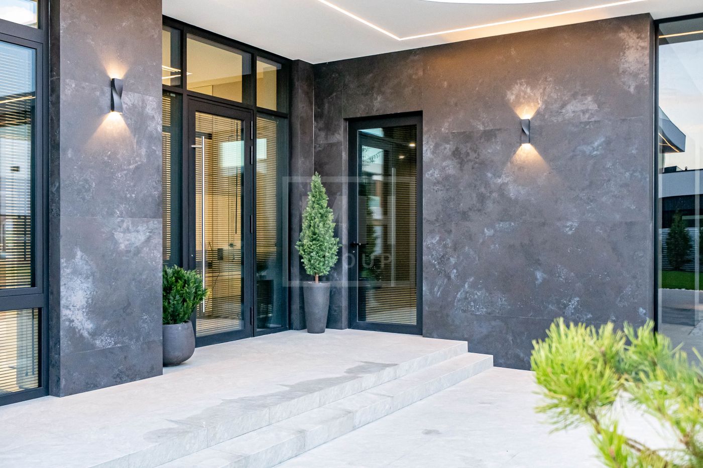 Все дома в поселке построены в едином стиле по мотивам архитектурных проектов Ф.Л. Райта. В строительстве и отделке использовались современные материалы. Для остекления были выбраны премиальные окна Schuco. На первом этаже располагается большая кухня гостиная со вторым светом, мастер спальня с гардеробной и своим санузлом, большой гараж на два машиноместа и большой навес на две машины. На втором этаже мастер спальня с гардеробной и ванной комнатой, две спальни со своими гардеробными и большой ванной комнатой. Дом очень нежный и светлый, цветовая гамма подобрана с учетом всех современных тенденция включая отделку, мебель и предметы интерьера.