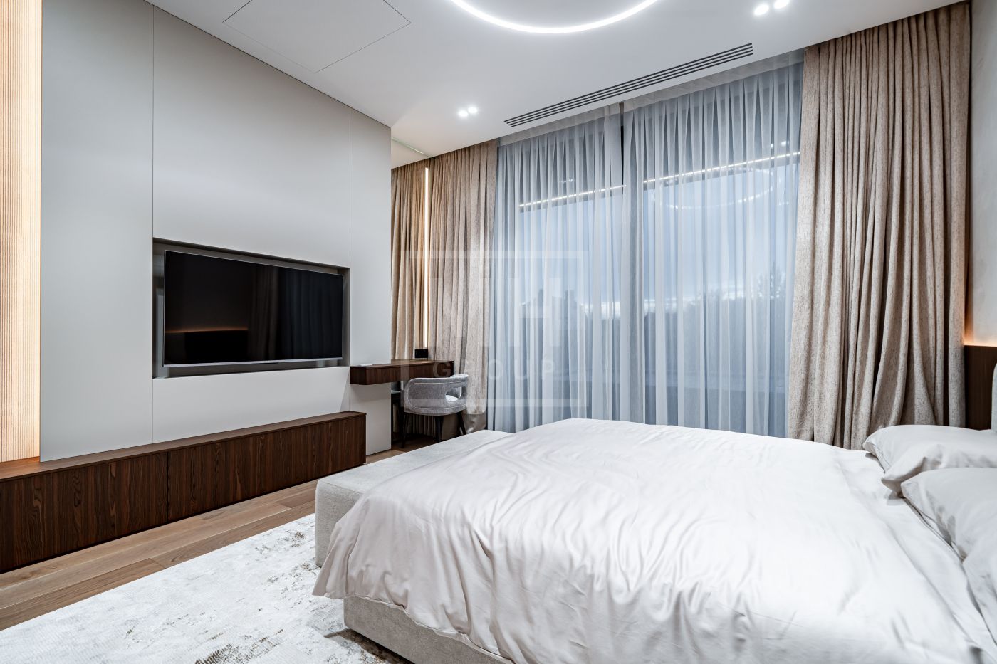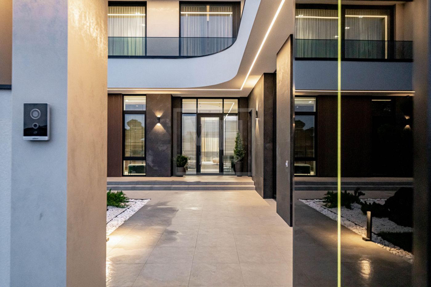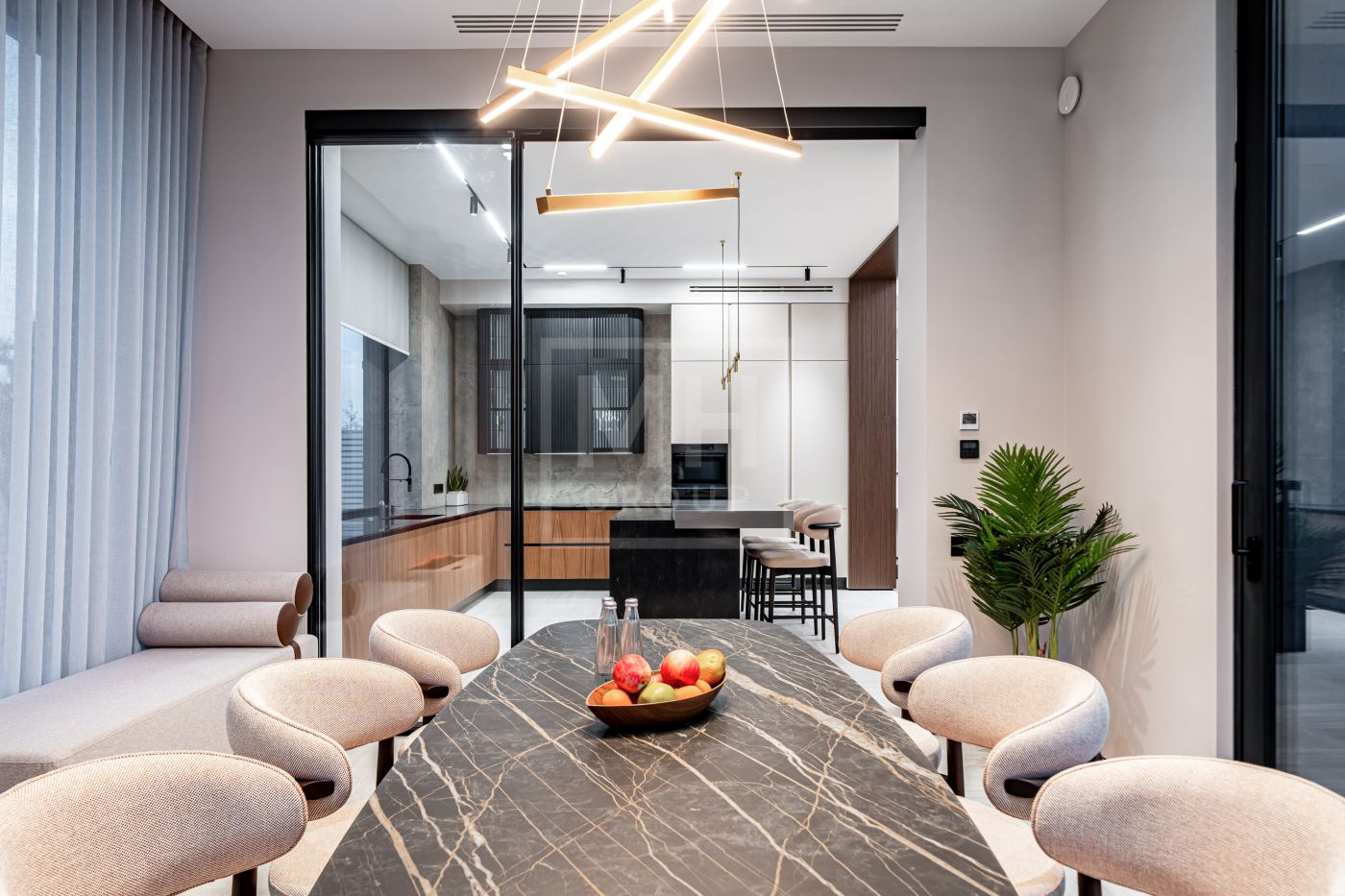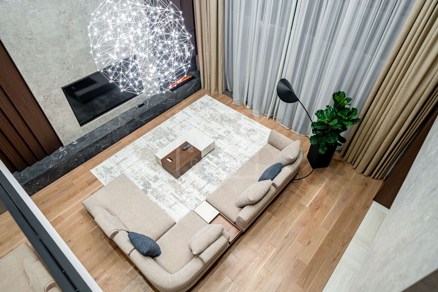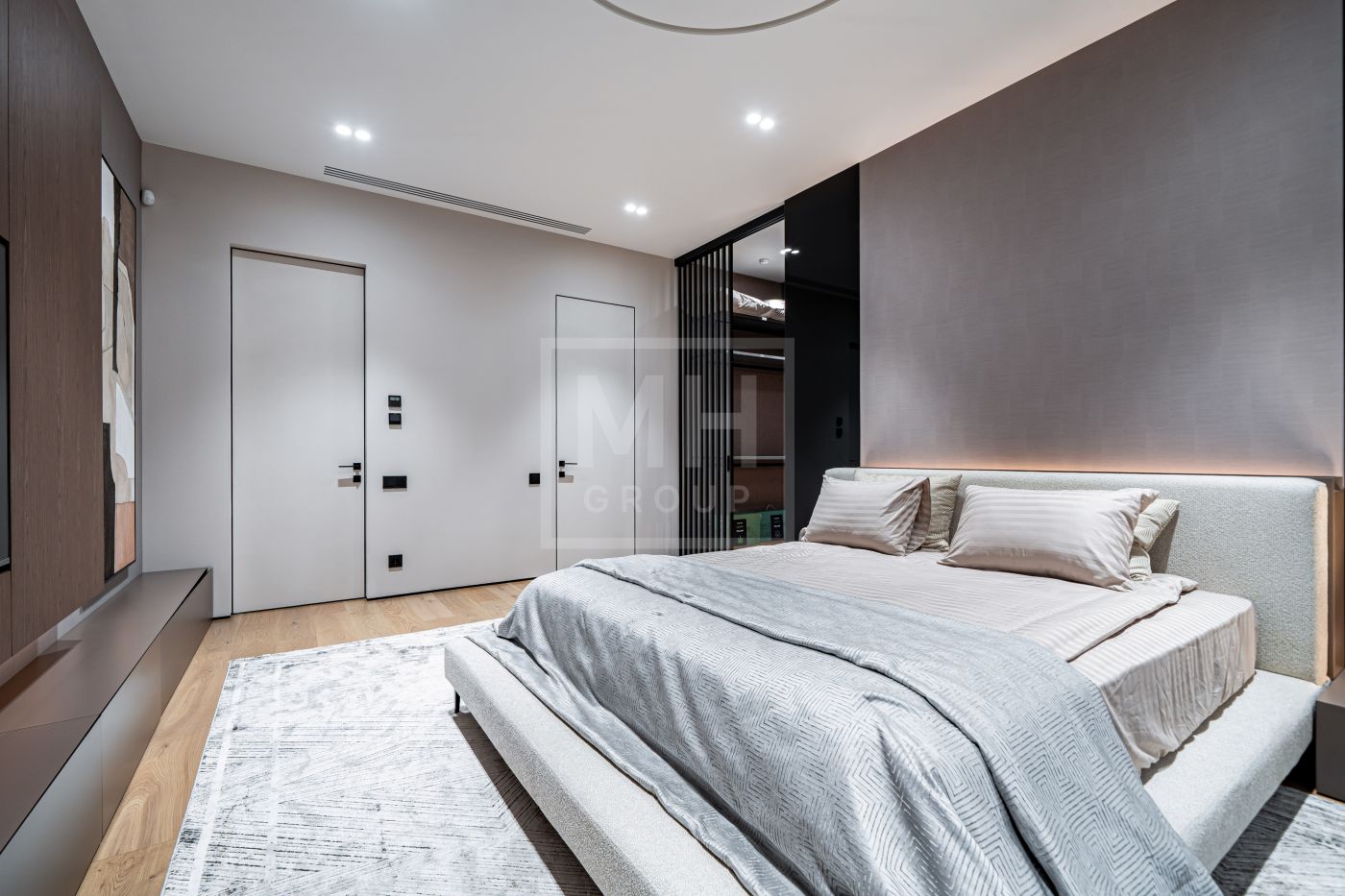 Все дома в поселке построены в едином стиле по мотивам архитектурных проектов Ф.Л. Райта. В строительстве и отделке использовались современные материалы. Для остекления были выбраны премиальные окна Schuco. На первом этаже располагается большая кухня гостиная со вторым светом, мастер спальня с гардеробной и своим санузлом, большой гараж на два машиноместа и большой навес на две машины. На втором этаже мастер спальня с гардеробной и ванной комнатой, две спальни со своими гардеробными и большой ванной комнатой. Дом очень нежный и светлый, цветовая гамма подобрана с учетом всех современных тенденция включая отделку, мебель и предметы интерьера.