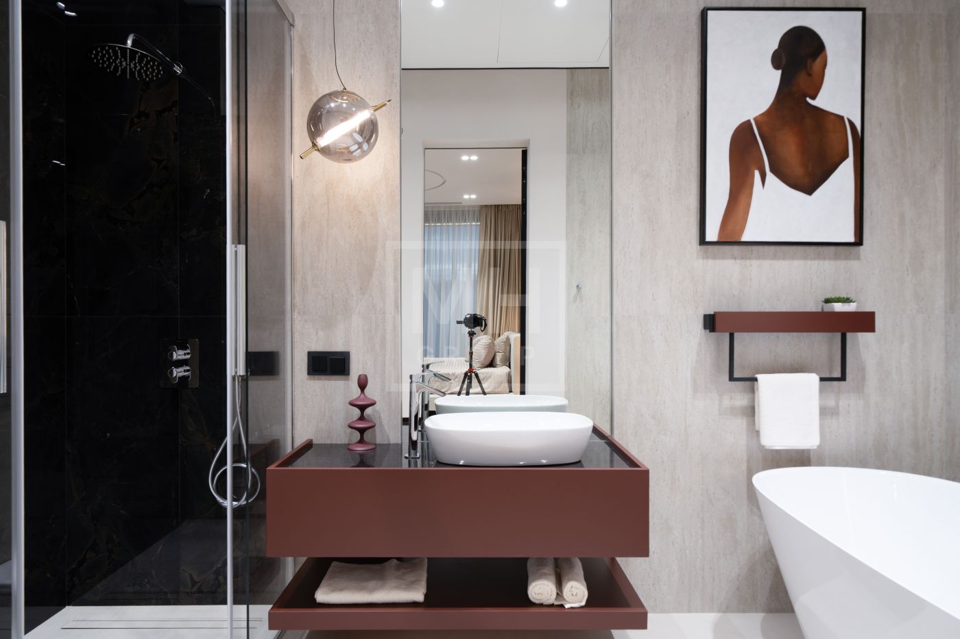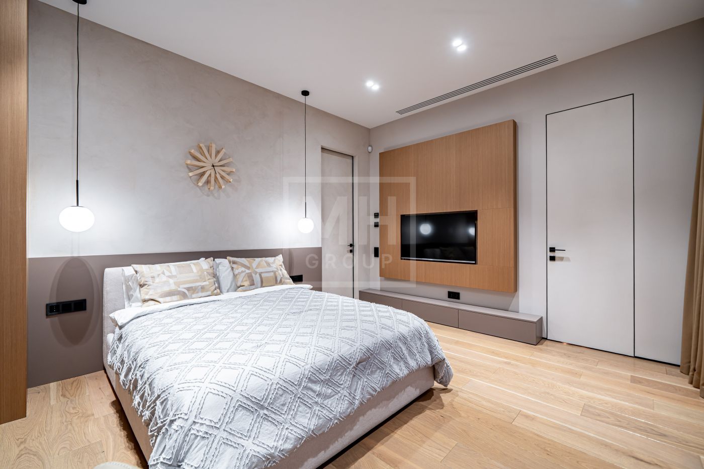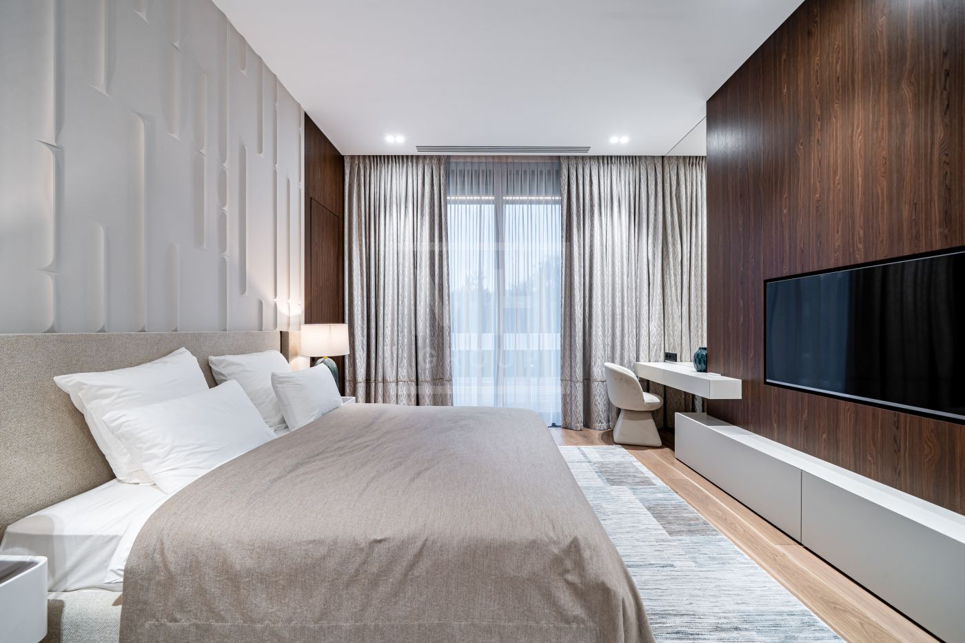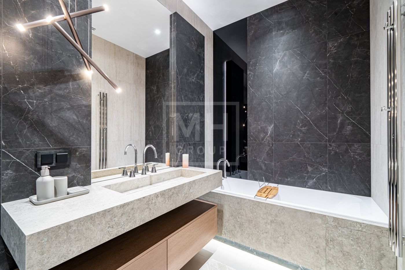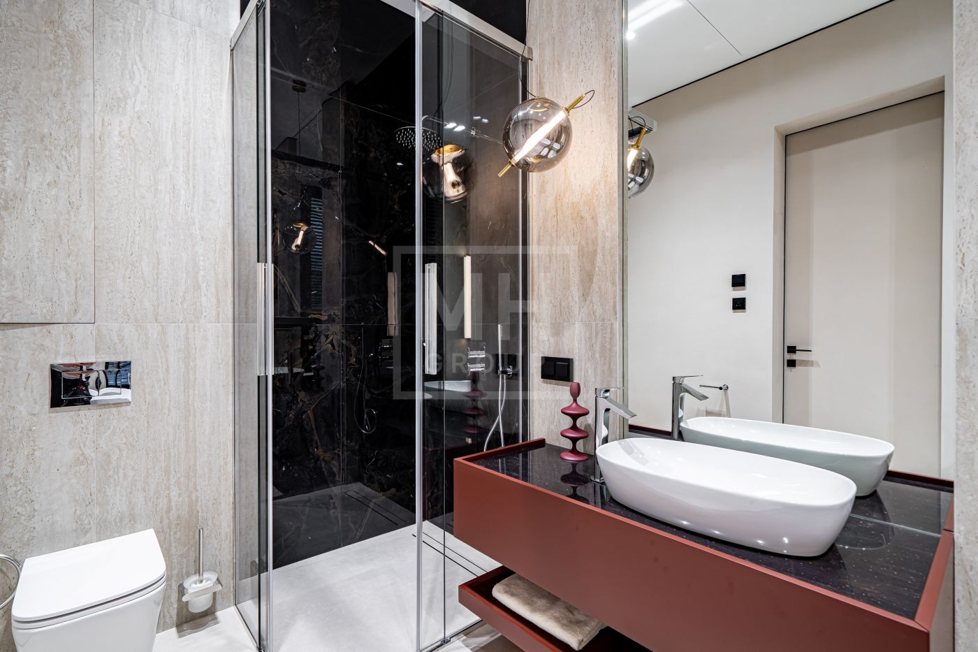 Все дома в поселке построены в едином стиле по мотивам архитектурных проектов Ф.Л. Райта. В строительстве и отделке использовались современные материалы. Для остекления были выбраны премиальные окна Schuco. На первом этаже располагается большая кухня гостиная со вторым светом, мастер спальня с гардеробной и своим санузлом, большой гараж на два машиноместа и большой навес на две машины. На втором этаже мастер спальня с гардеробной и ванной комнатой, две спальни со своими гардеробными и большой ванной комнатой. Дом очень нежный и светлый, цветовая гамма подобрана с учетом всех современных тенденция включая отделку, мебель и предметы интерьера.