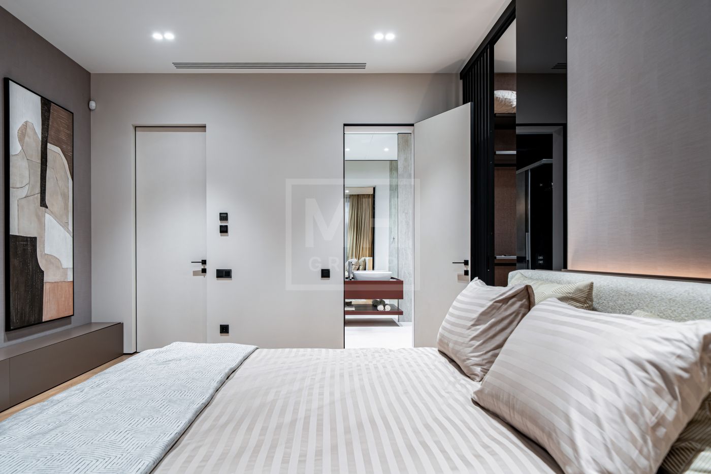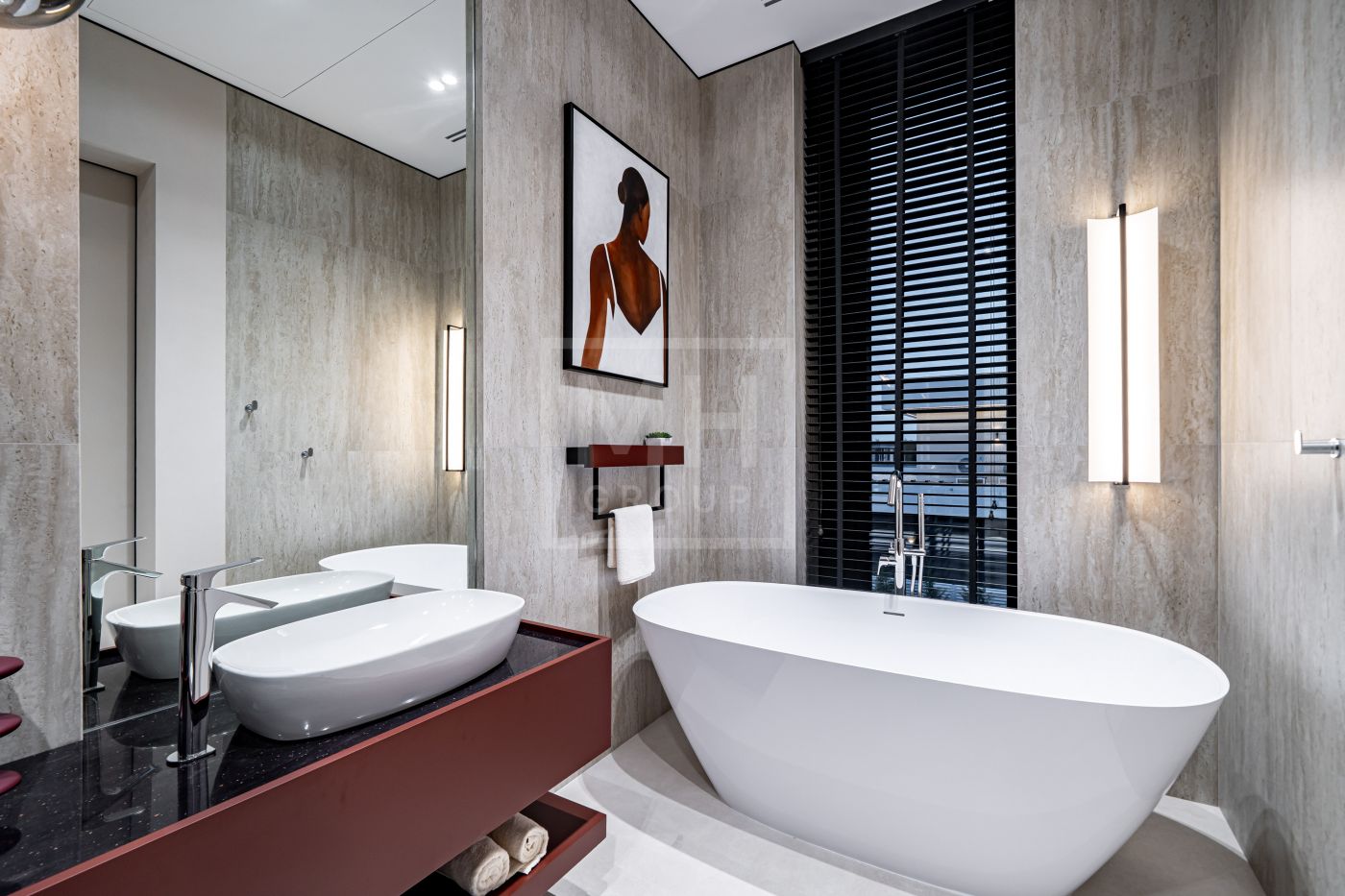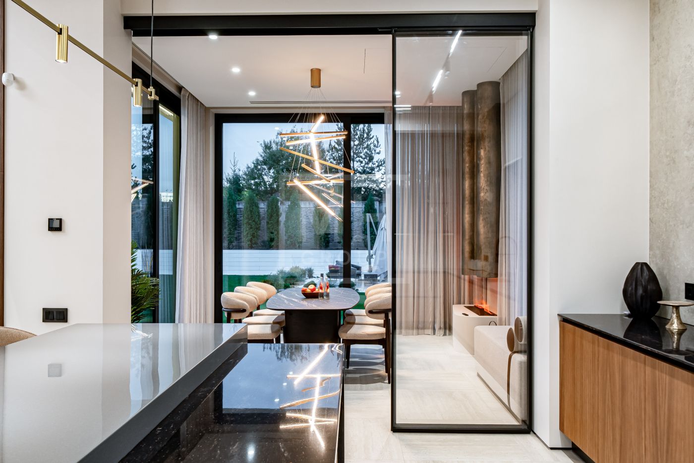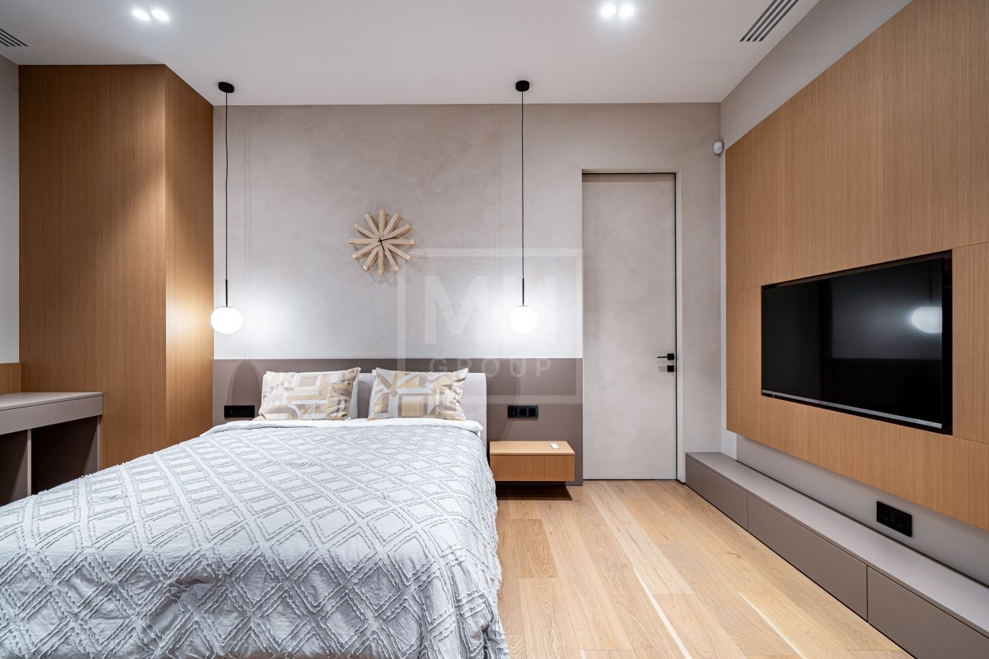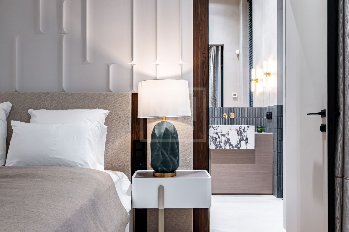 Все дома в поселке построены в едином стиле по мотивам архитектурных проектов Ф.Л. Райта. В строительстве и отделке использовались современные материалы. Для остекления были выбраны премиальные окна Schuco. На первом этаже располагается большая кухня гостиная со вторым светом, мастер спальня с гардеробной и своим санузлом, большой гараж на два машиноместа и большой навес на две машины. На втором этаже мастер спальня с гардеробной и ванной комнатой, две спальни со своими гардеробными и большой ванной комнатой. Дом очень нежный и светлый, цветовая гамма подобрана с учетом всех современных тенденция включая отделку, мебель и предметы интерьера.