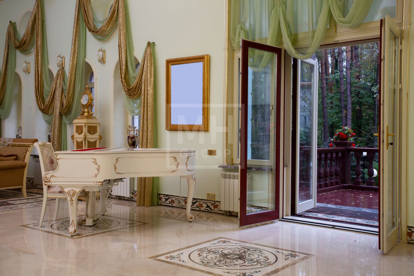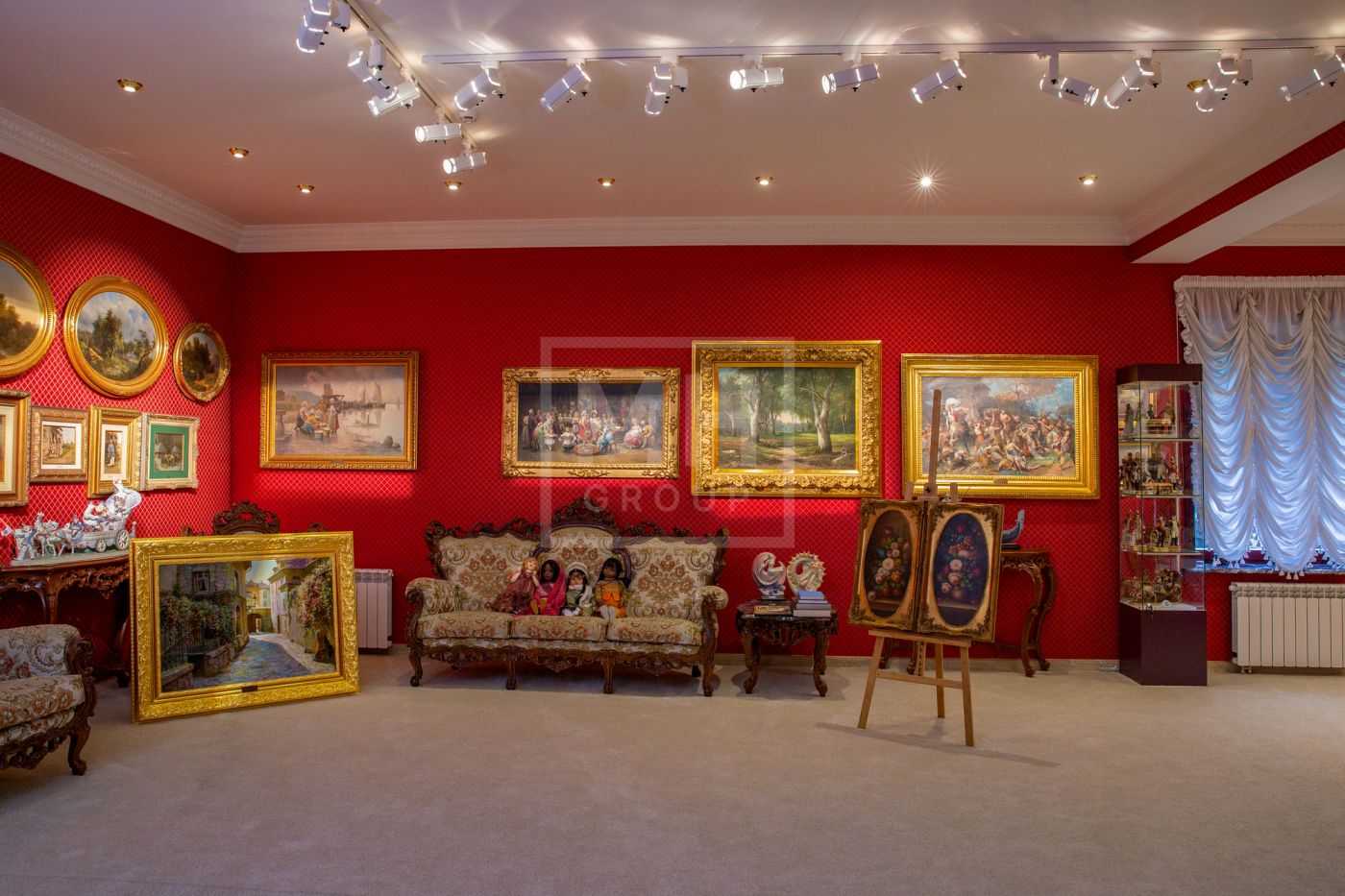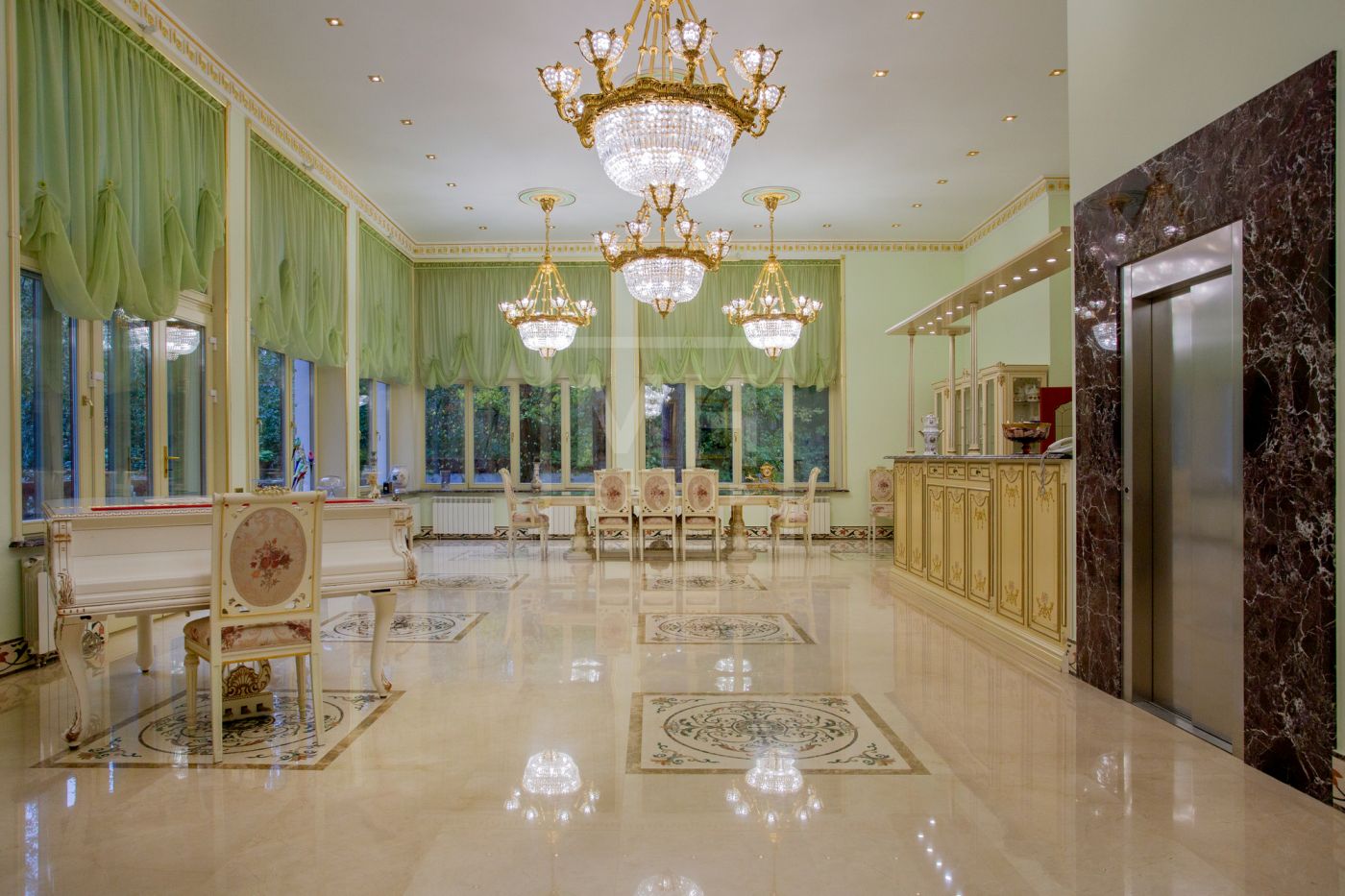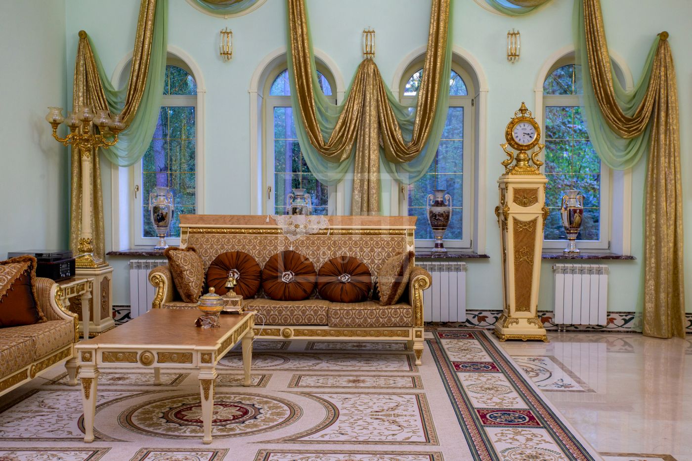 Интерьер дома выполнен с безупречным вкусом, в классическом стиле с элементами роскоши. Большая часть мебели была привезена из Италии. Просторные помещения наполнены естественным светом. Центральное место в доме занимает зал для приемов площадью 145 м² — настоящий шедевр, с мраморным полом, люстрами из золоченой бронзы и испанского хрусталя, а также потолочными фризами, покрытыми сусальным золотом. Особую атмосферу придает собственная художественная галерея, где собрана коллекция произведений искусства (возможна продажа отдельно). Многие залы украшены французским шелком, что придает интерьеру благородный шарм.