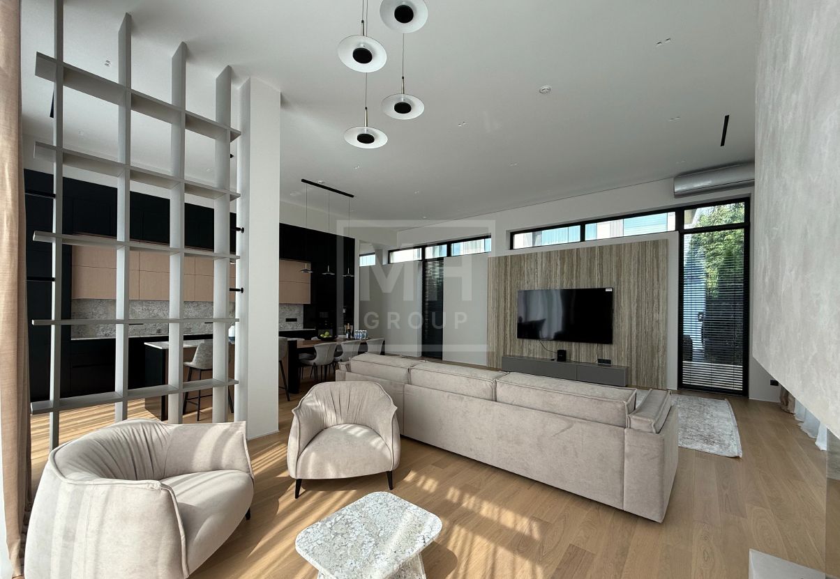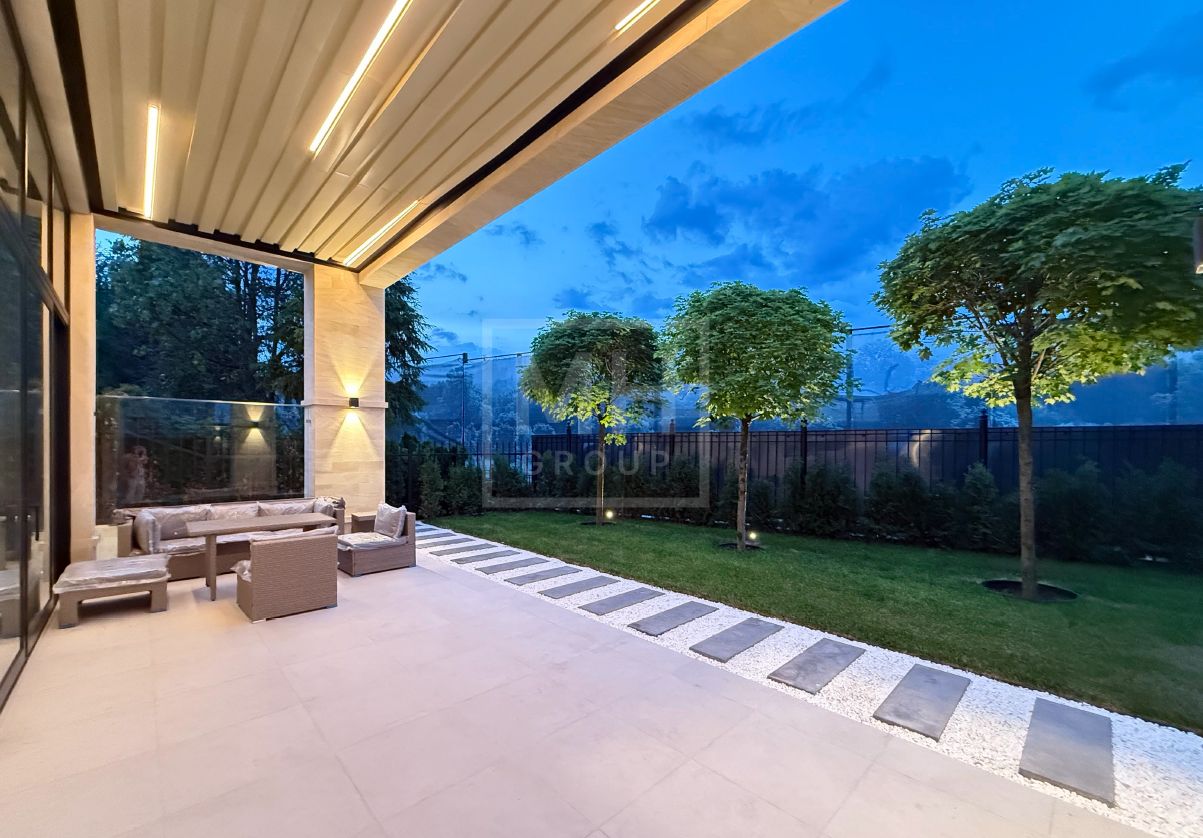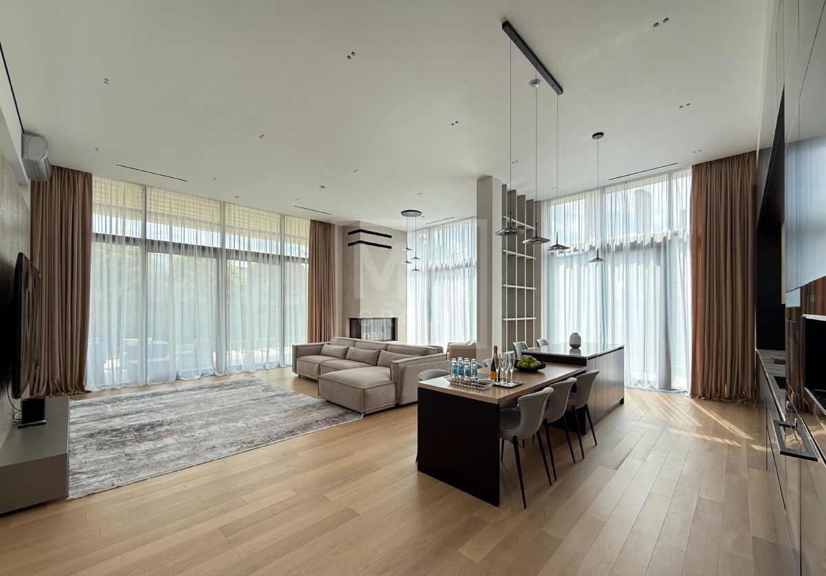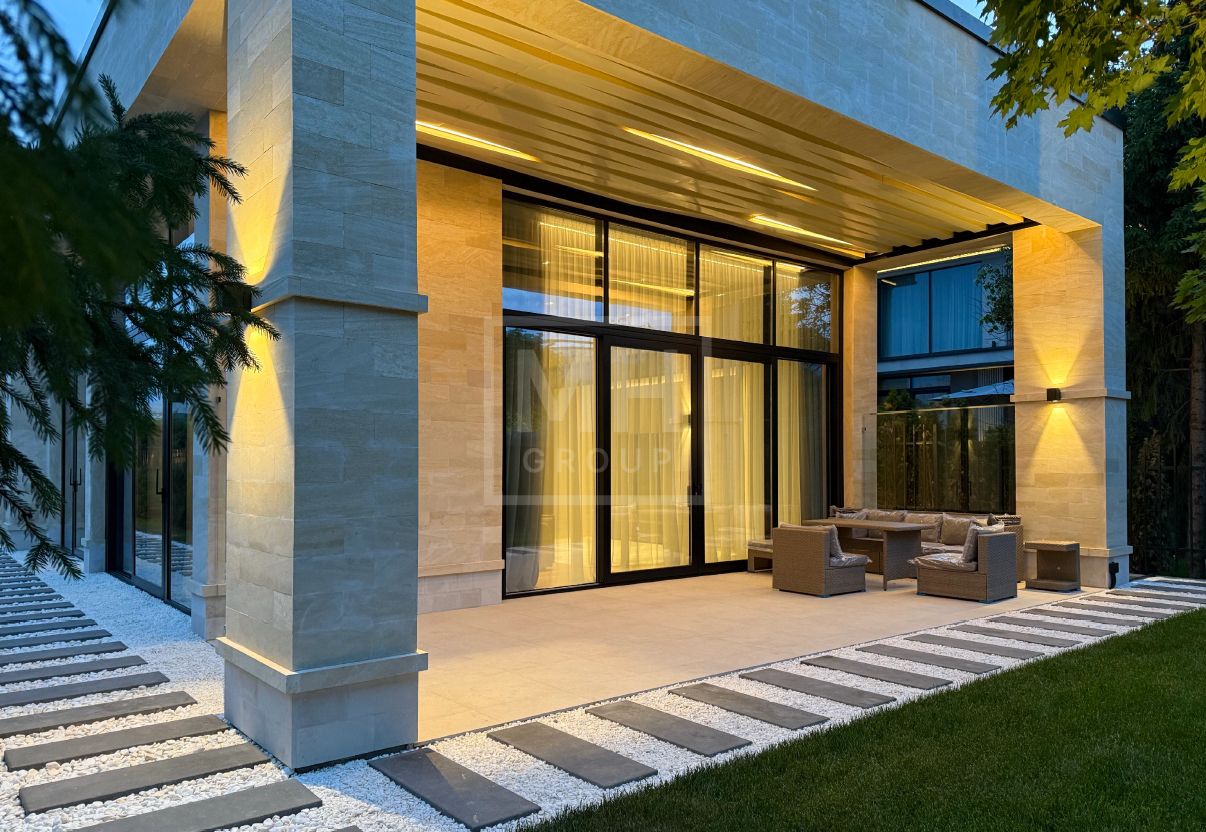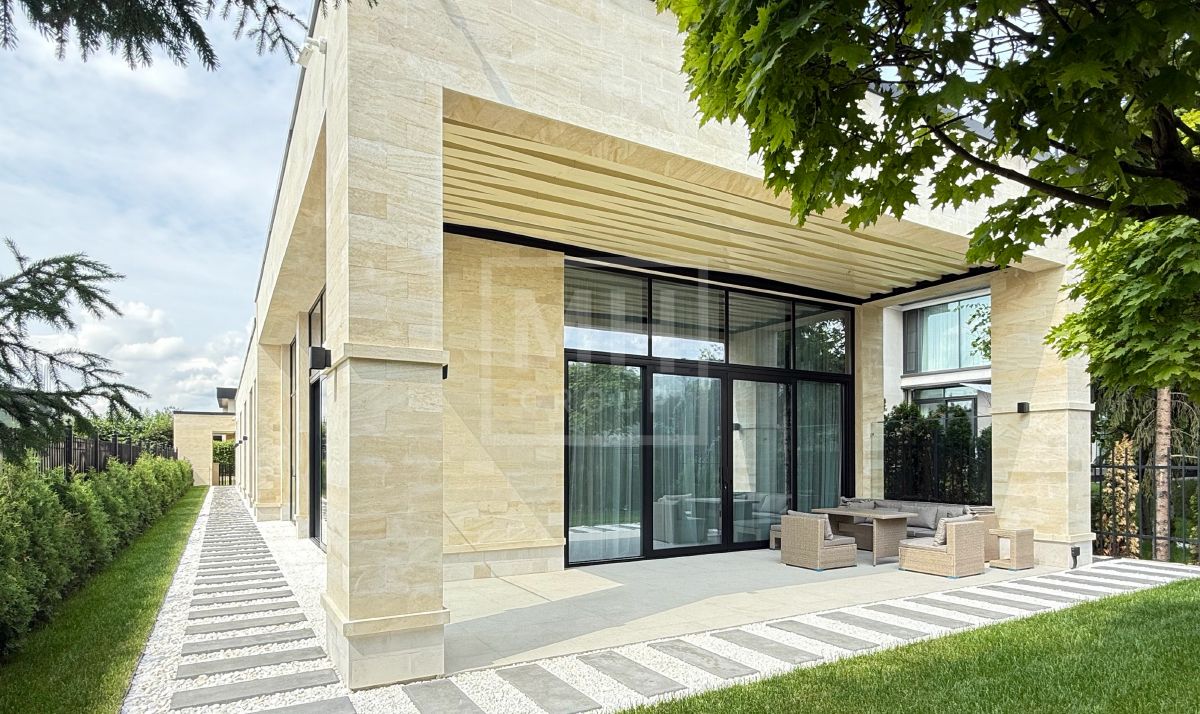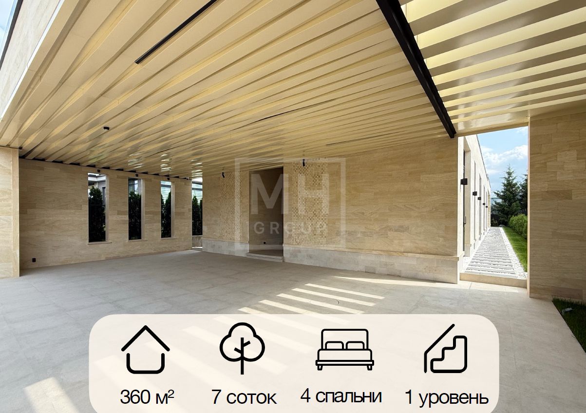 Современный одноэтажный дом под ключ в одном из лучших поселков Новорижского шоссе Миллениум Парке. Планировкой предусмотрены 4 спальни, постирочная, рабочая кухня с отдельным входом, зона кухни-столовой-гостиной с выходом на крытую террасу, котельная а также навес для автомобилей. Фасад дома выполнен из натурального камня. В отделке и предметах интерьера преобладают светлые тона, что делают его очень уютным. На участке правильной формы выполнен ландшафт, высажены декоративные растения. Вечернее освещение в сочетании с подсветкой фасада создают очень приятную атмосферу в любое время года. Дом располагается совсем рядом с прогулочной зоной вдоль каналов, по которой можно прогуляться до основных озер поселка.