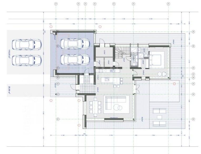 Гараж на два автомобиля и открытая парковка перед ним, обеспечивает удобное размещение транспорта.
