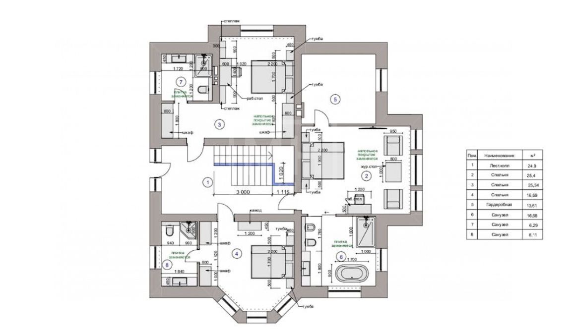Этаж 2: Мастер - спальня с гардеробной и с/у, 2 спальни с гардеробными и с/у