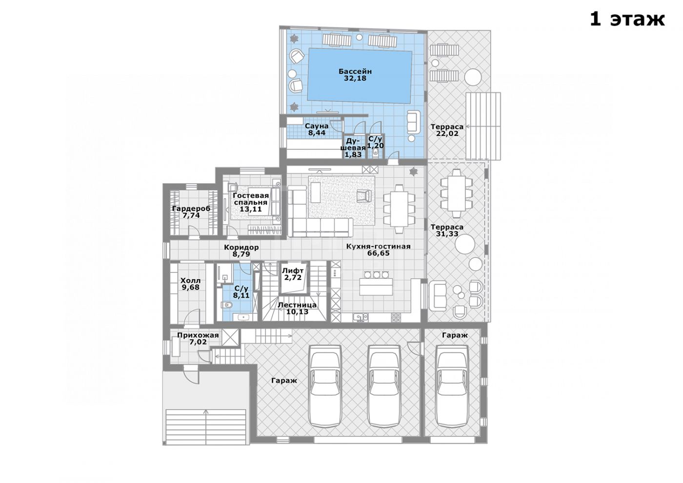 Этаж 1: кухня-гостиная (66,6) с выходом на террасу (31), гостевая спальня (13,1), прихожая (7), холл (9,7 и 8,8), гардеробная (7,7), гостевой с/у (8). Спа-зона с выходом на террасу: бассейн (50,2), сауна (8,4), душевая (1,8), с/у (1,2).