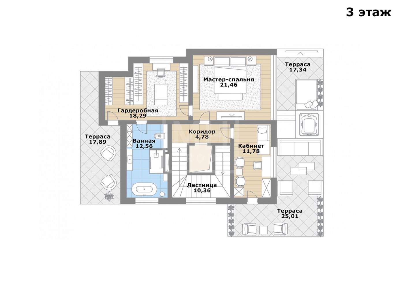 Этаж 3: мастер-спальня (21,5) с выходом на террасу, гардеробная (18,3), ванная комната (12,6), кабинет (11,8) с выходом на террасу (25).