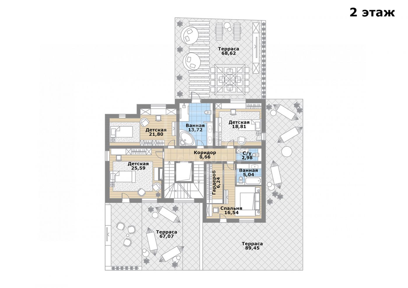 Этаж 2: спальня №1 (16,5) с гардеробной (6,2), ванной комнатой (5) и выходом на террасу (89), спальня №2 (25,6) с выходом на террасу (67), спальня №3 (21,8), спальня №4 (18,8), ванная комната (13,7), терраса (68), с/у (2,9).