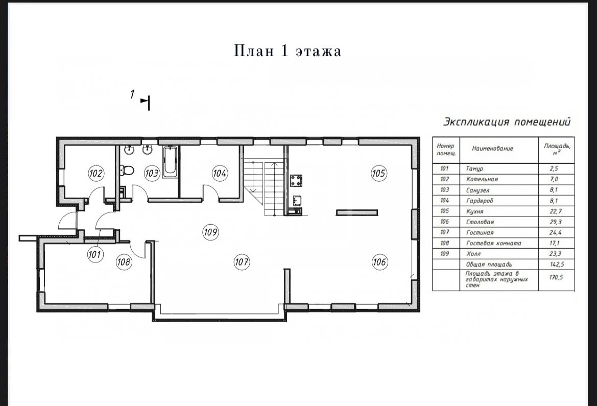 Этаж 1: Холл, гостевой санузел, котельная, гардеробная, кухня-столовая, гостиная, гостевая комната/кабинет.