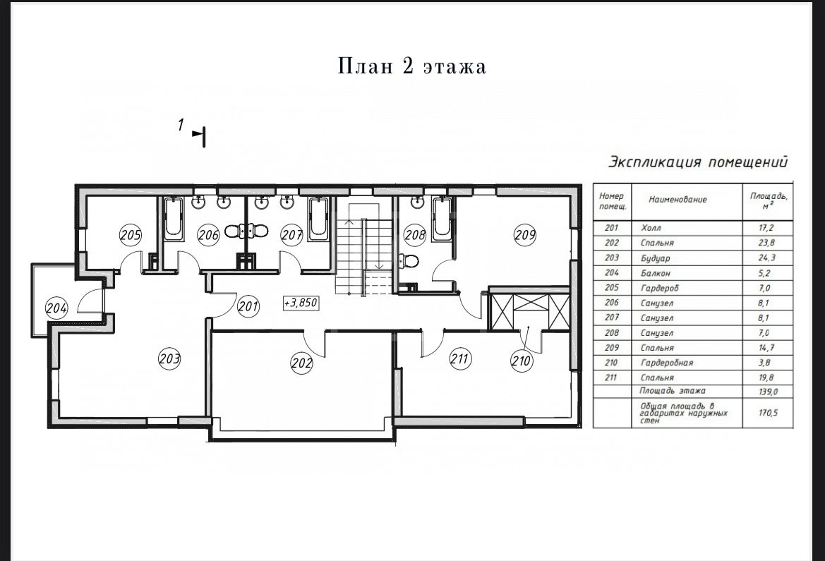 Этаж 2: Холл, Мастер спальня со своим санузлом и гардеробной, с выходом на балкон, спальня с санузлом, 2 спальни и санузел.