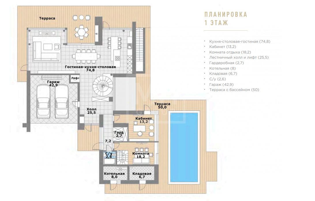 Этаж 1: Прихожая, гардеробная, с/у, кухня-столовая-гостиная, кабинет, комната отдыха, кладовая, терраса с бассейном, котельная, гараж