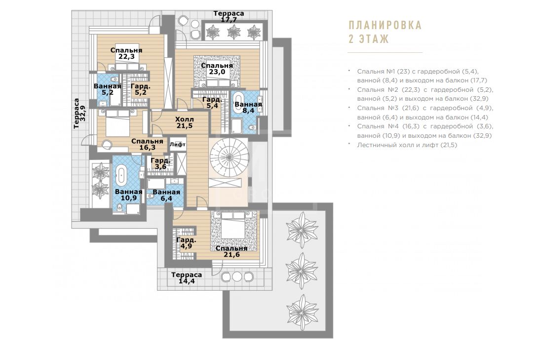 Этаж 2: мастер -спальня с гардеробной и с/у, 3 спальни с гардеробной и с/у
