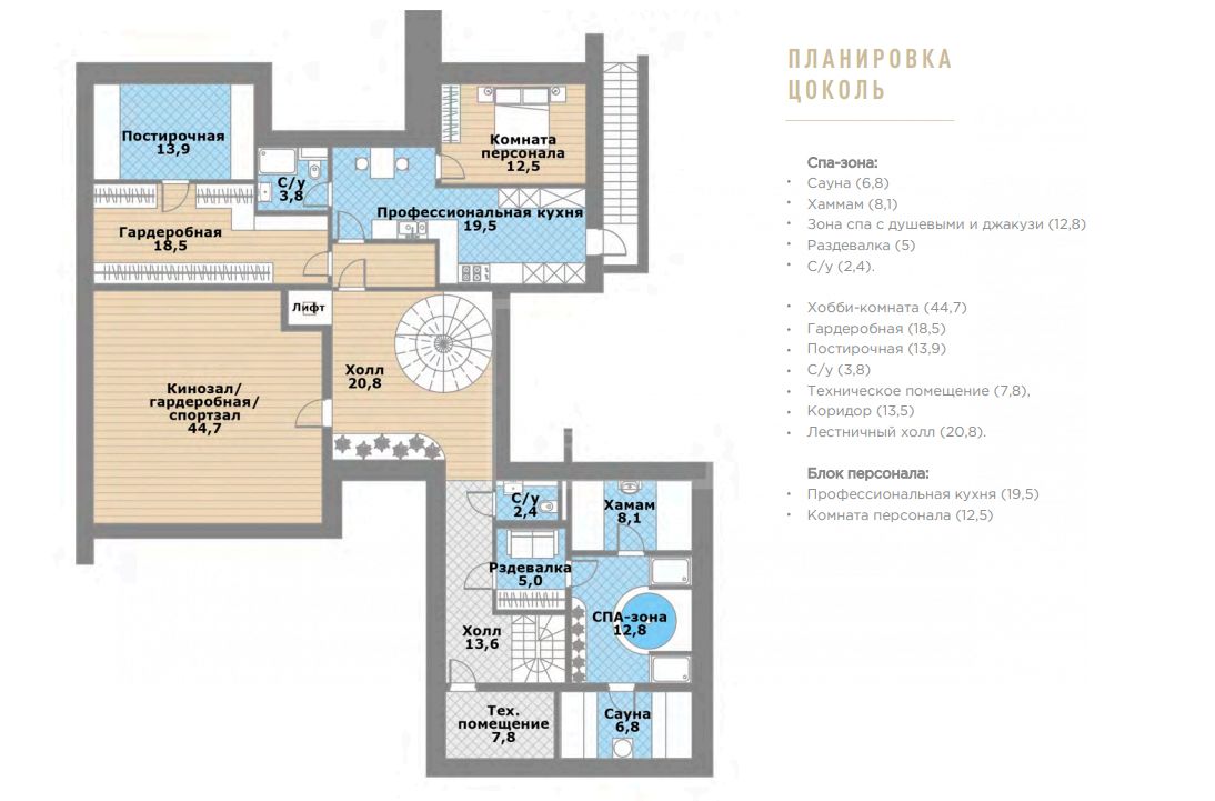 Цоколь: Спа-зона с сауной, хамамом, душевой, раздевалкой и с/у, постирочная, хобби-комната, гардеробная, с/у, техническое помещение, блок для персонала