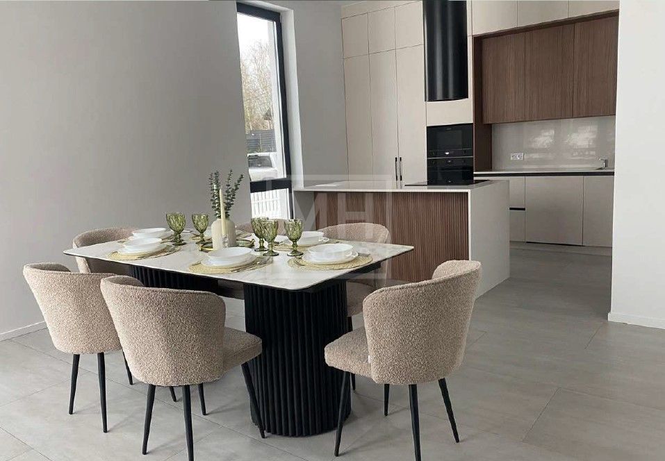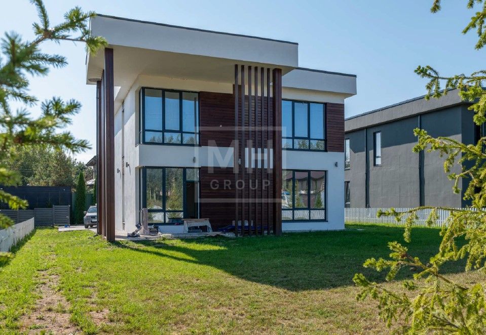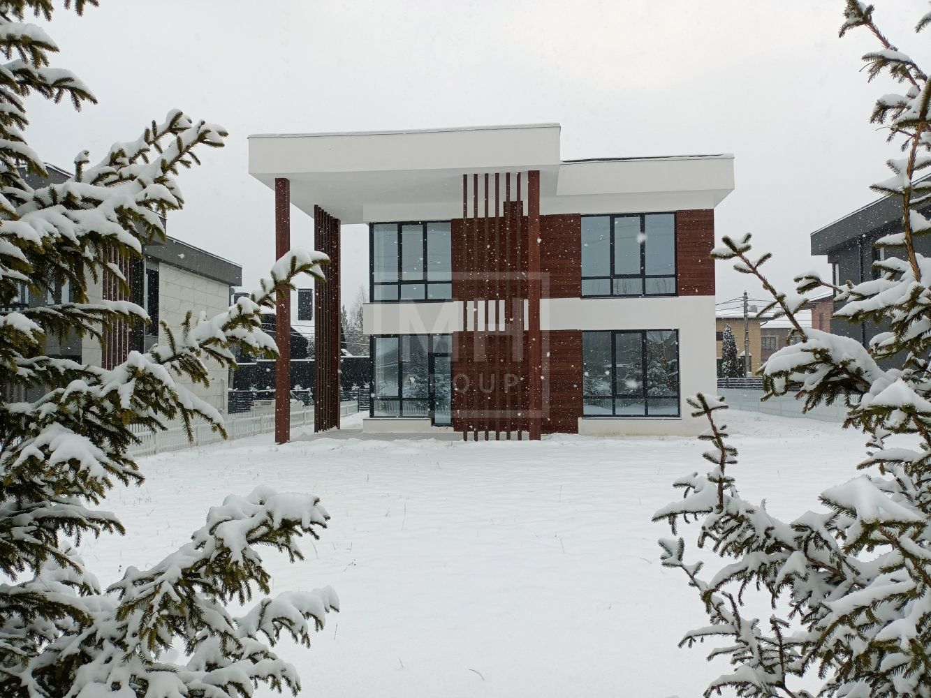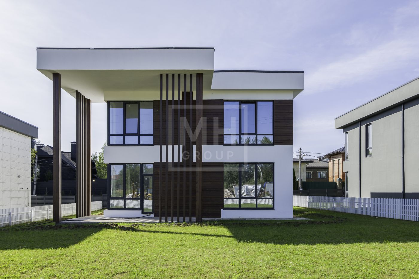 Двухэтажный дом в современном стиле, станет вашим идеальным пространством для жизни!Фасад дома выполнен из штукатурки белого цвета с декоративными панелями под дерево.