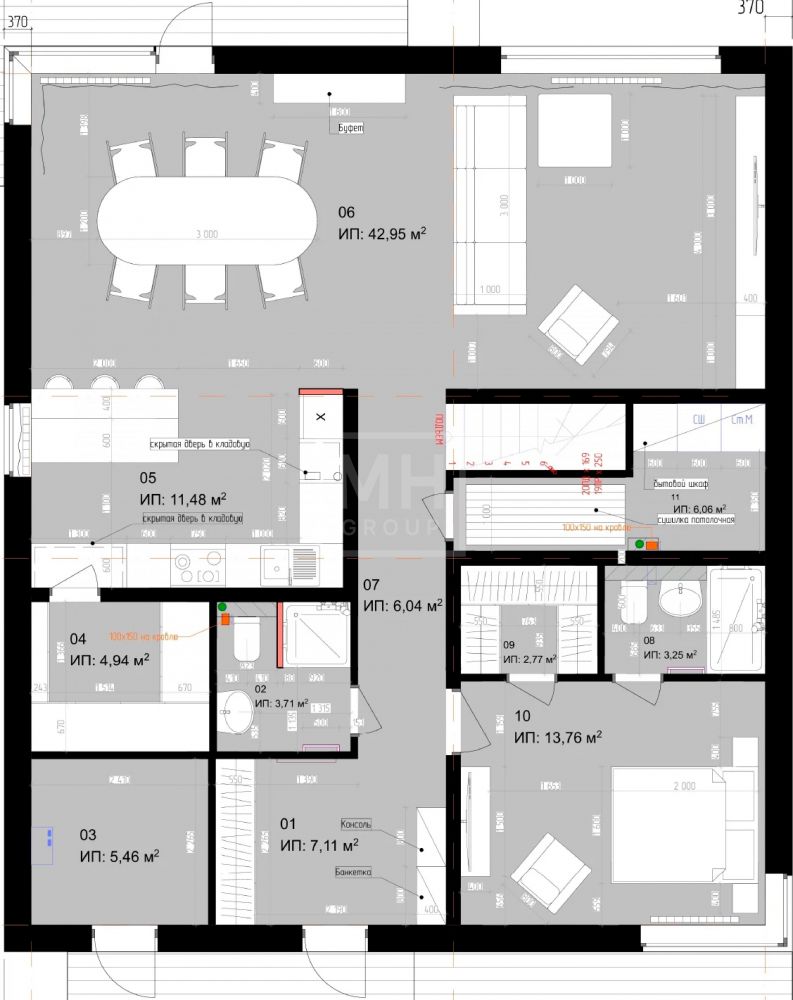 Этаж 1: прихожая, с/у, кухня-столовая с кладовой и выходом на террасу, уютная гостиная, гостевая спальня с с/у и гардеробной, постирочная, газовая котельная с отдельным входом