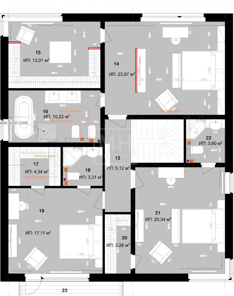 Этаж 2: мастер-блок с большой гардеробной и с/у, спальня со своим с/у, гардеробной и балконом, спальня со своим с/у и гардеробной