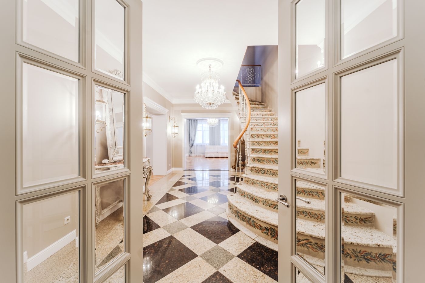 Сдержанные тона, великолепные люстры, кованые перила и сантехника в английской стилистике, добавляют изысканности.