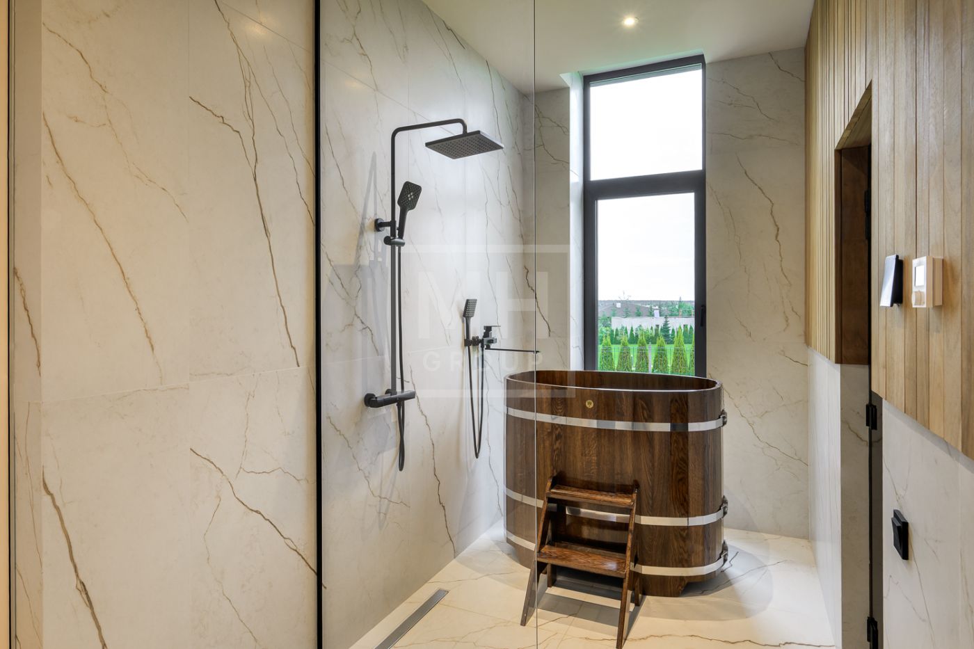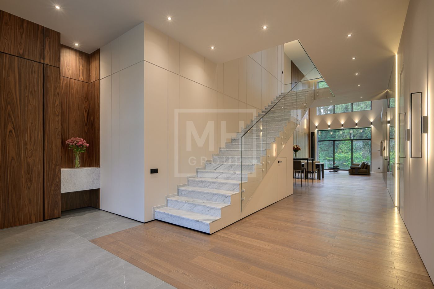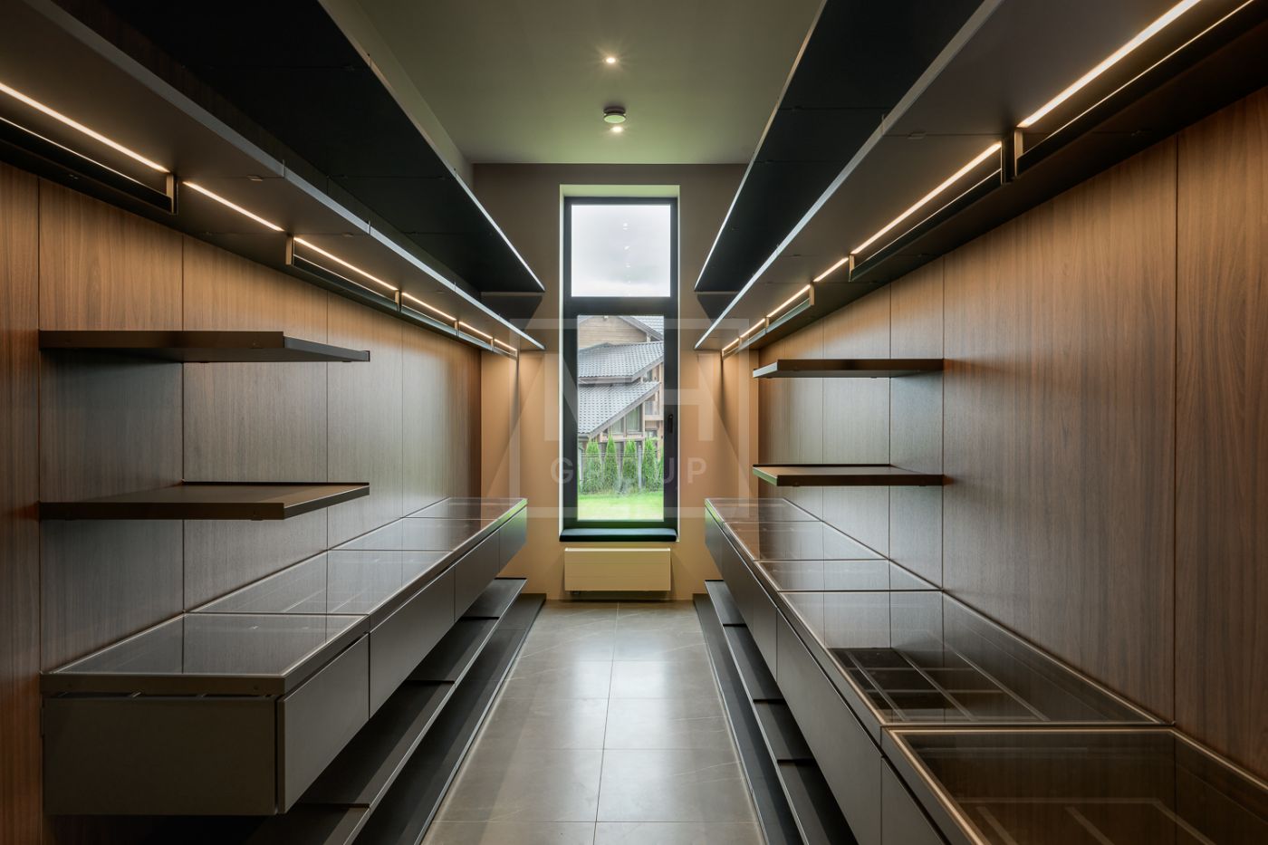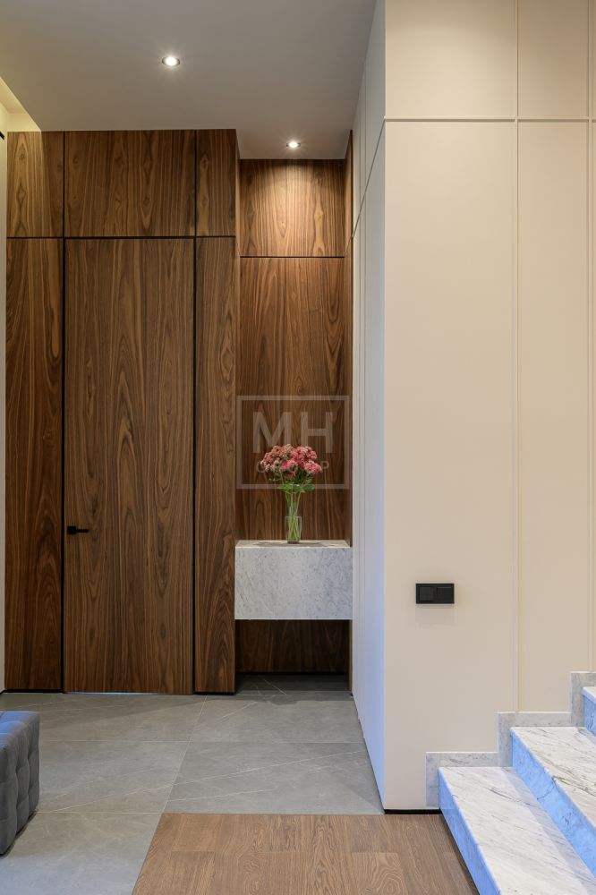 Входная группа: холл 15 м2, гардеробная верхней одежды 14 м2, гостевой блок (или блок персонала) – 2 спальни, гостевой санузел с душевой, гостевая гардеробная и кабинет 20 м2.