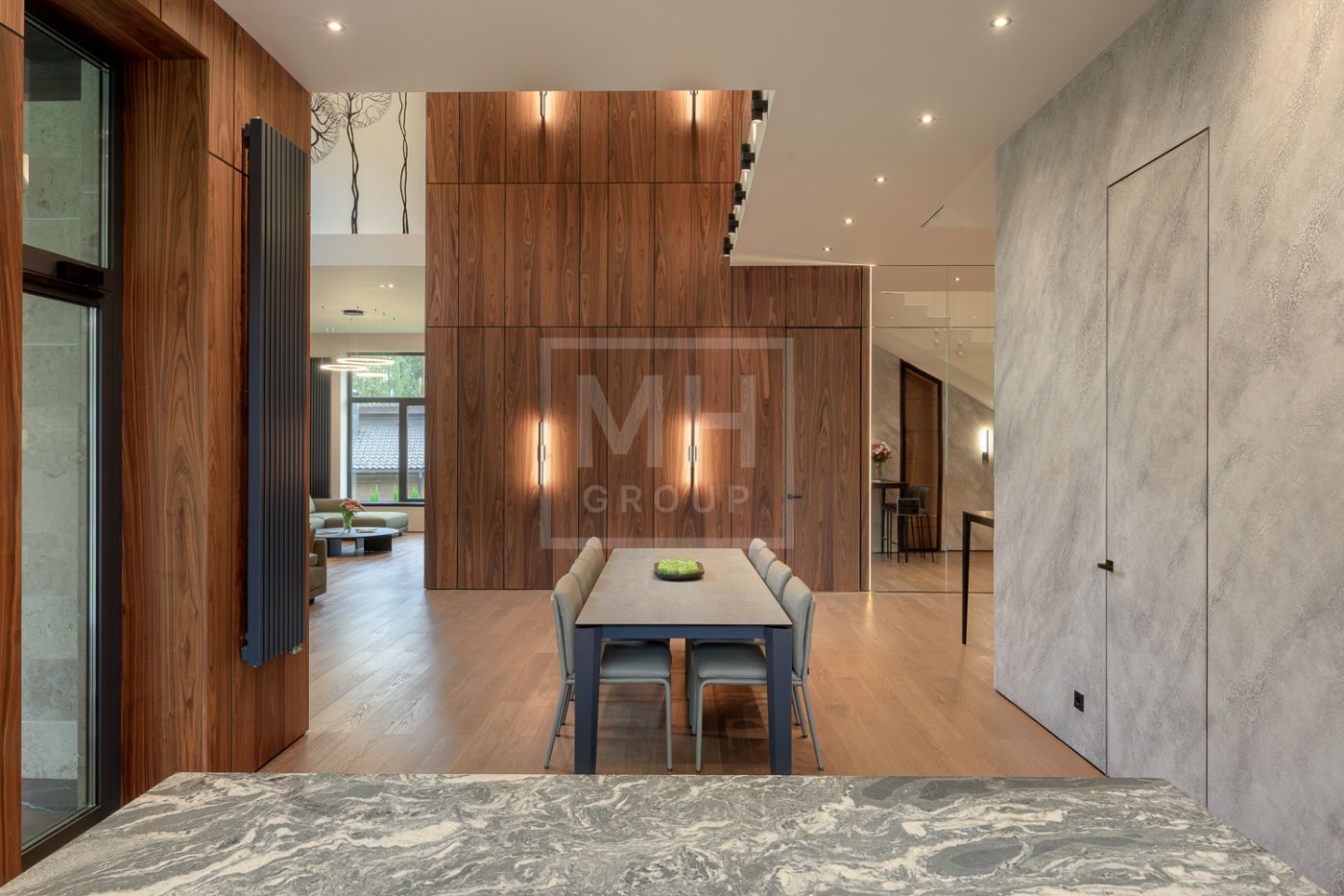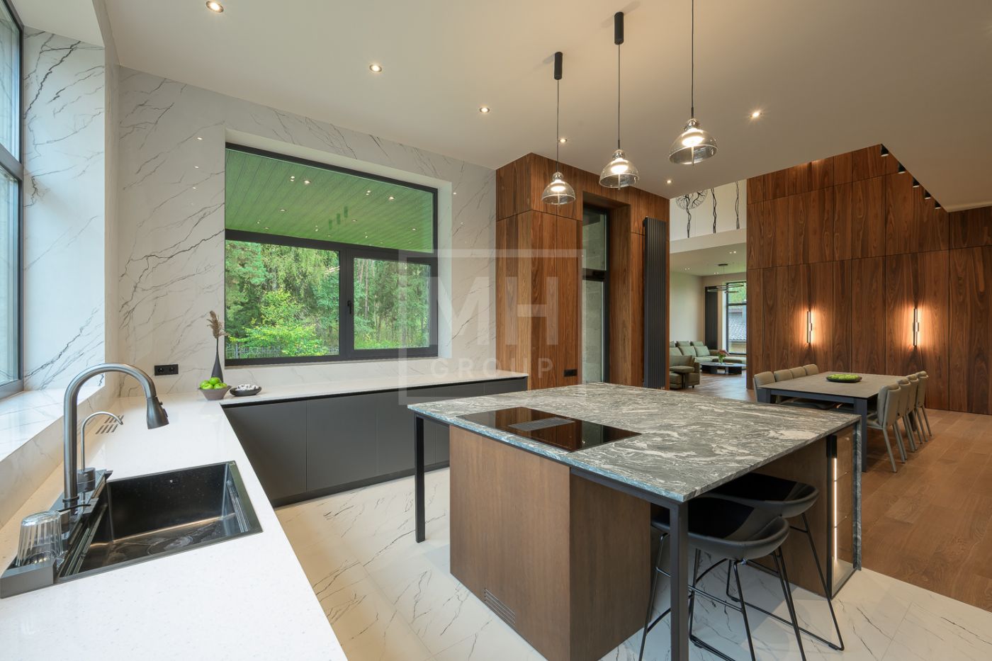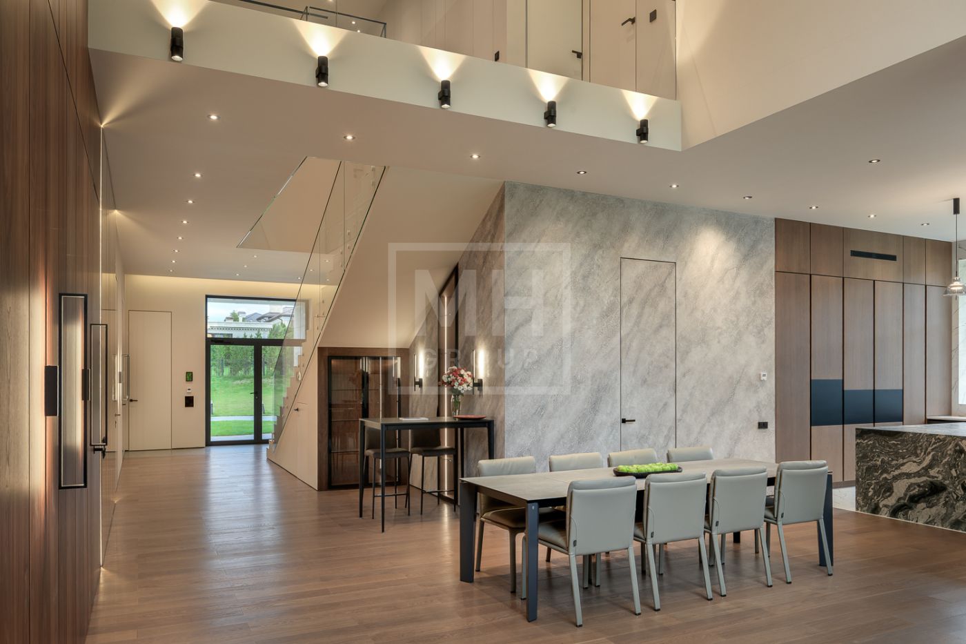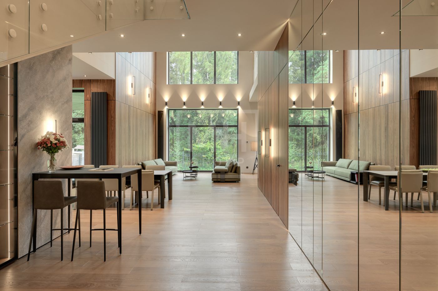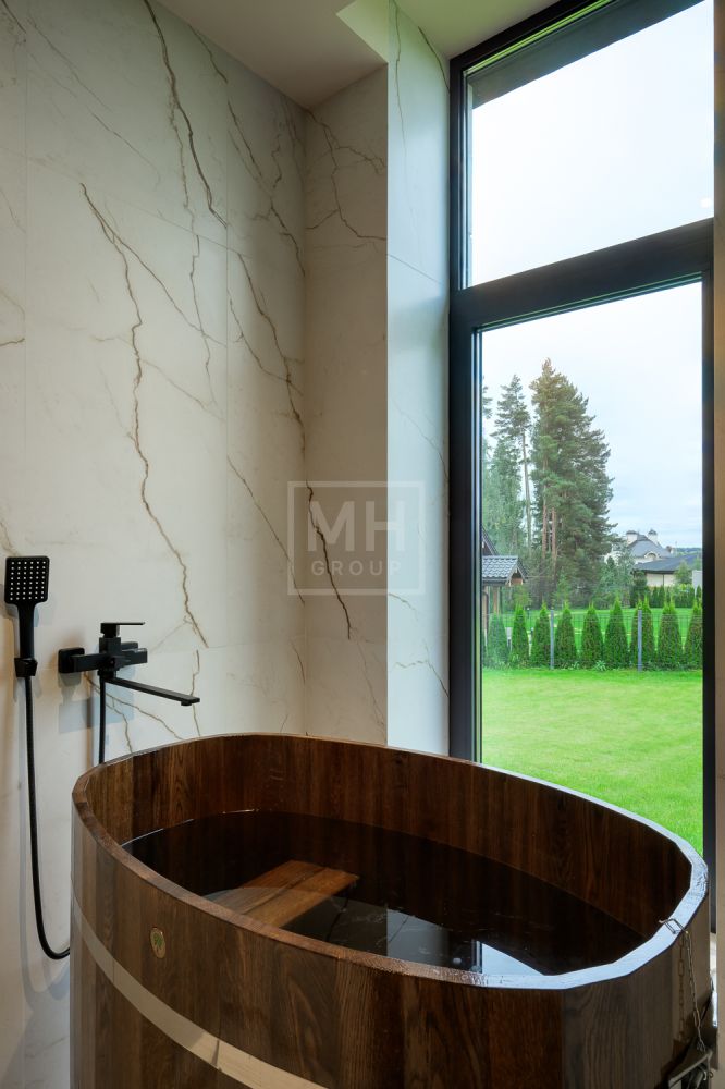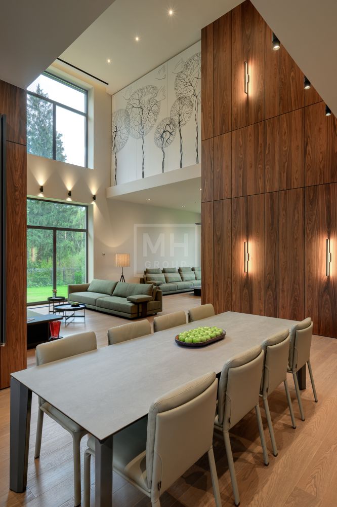 Общественная зона: Гостиная-столовая-кухня - единое пространство со вторым светом, общей площадью 115 м2 и объемом - 570 м3 (выделено 5 функциональных зон: медиа зона с ТВ и дровяным камином, лаунж зона с возможностью размещения двух больших диванов, столовая, с возможностью размещения стола до 20 посадочных мест, зона бара с двумя сервантами и местом под барную стойку, парадная кухня с островом 20 м2 (с доступом в рабочую кухню 12 м2)). Окна этого пространства смотрят на восток, юг и запад. Блок свободного назначения с санузлом и сауной (общая площадь блока 37 м2. Комната может использоваться как игровая, СПА, спортзал, кинотеатр, бильярдная и т.д.). Крытая терраса с видом на лес с доступом из кухни и столовой. Хозяйский санузел первого этажа, оснащенный умывальником, унитазом, биде и писсуаром.