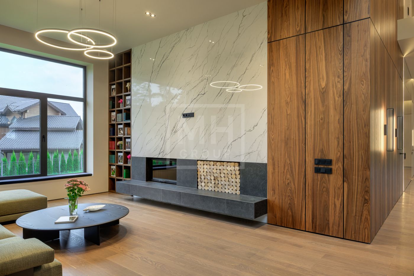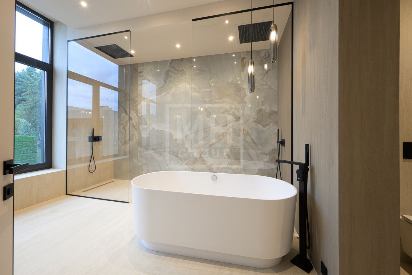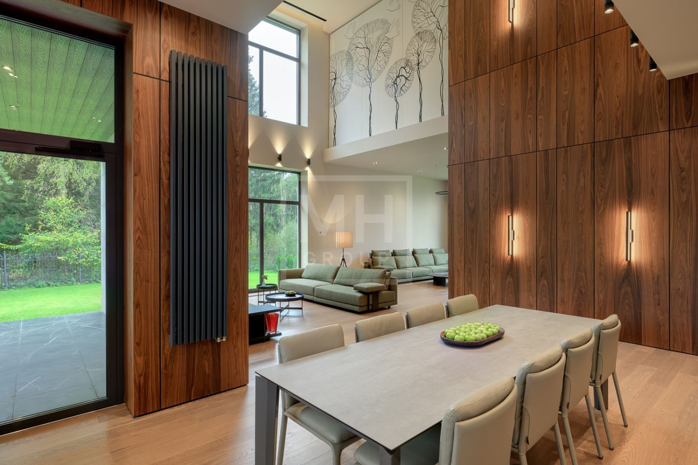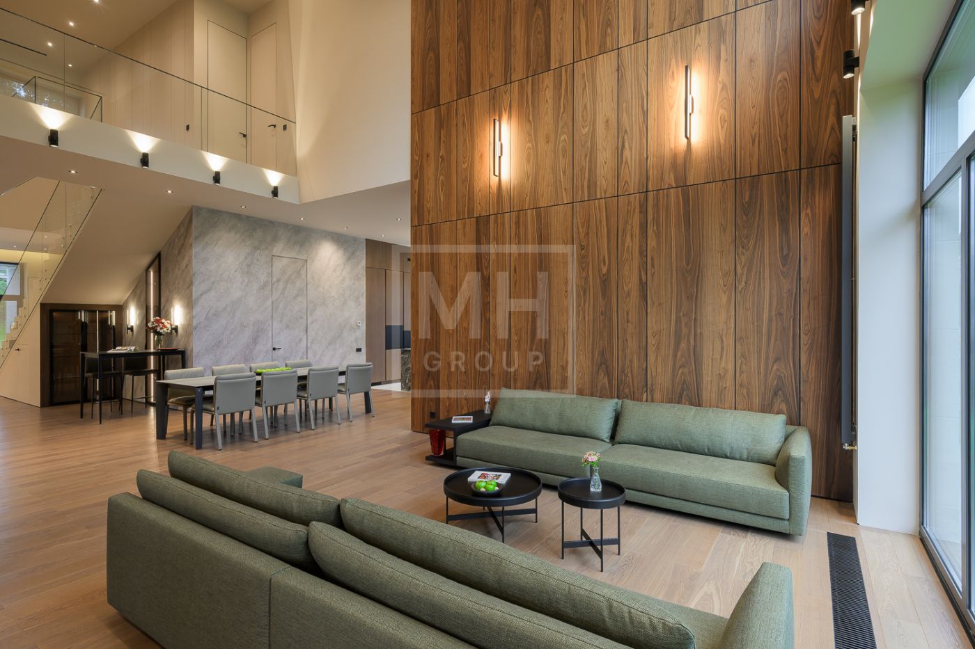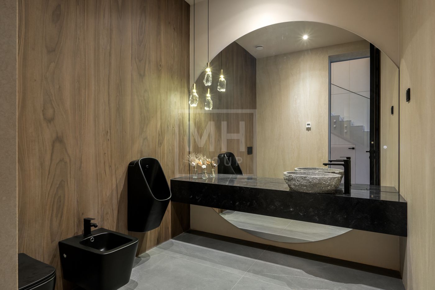 Общественная зона: Гостиная-столовая-кухня - единое пространство со вторым светом, общей площадью 115 м2 и объемом - 570 м3 (выделено 5 функциональных зон: медиа зона с ТВ и дровяным камином, лаунж зона с возможностью размещения двух больших диванов, столовая, с возможностью размещения стола до 20 посадочных мест, зона бара с двумя сервантами и местом под барную стойку, парадная кухня с островом 20 м2 (с доступом в рабочую кухню 12 м2)). Окна этого пространства смотрят на восток, юг и запад. Блок свободного назначения с санузлом и сауной (общая площадь блока 37 м2. Комната может использоваться как игровая, СПА, спортзал, кинотеатр, бильярдная и т.д.). Крытая терраса с видом на лес с доступом из кухни и столовой. Хозяйский санузел первого этажа, оснащенный умывальником, унитазом, биде и писсуаром.