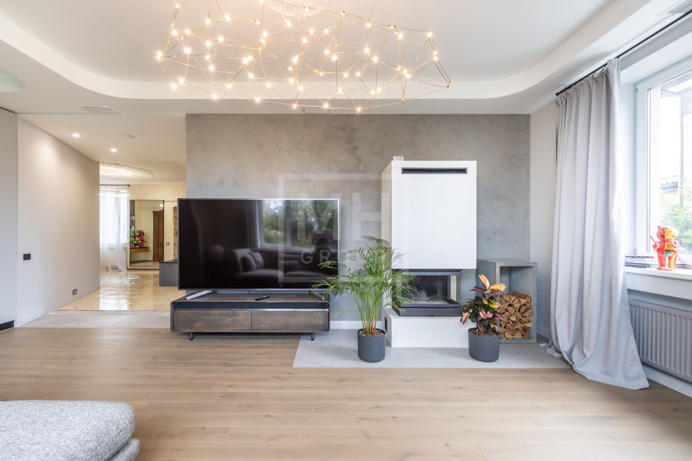 Этаж 1: прихожая, кухня-гостиная с каминном и выходом на закрытую отапливаемую террасу, спальня, с/у, котельная