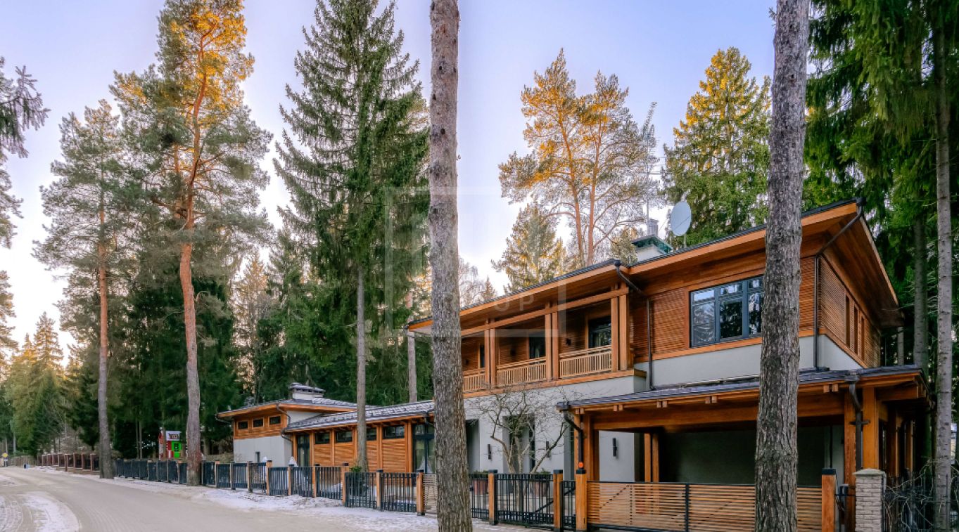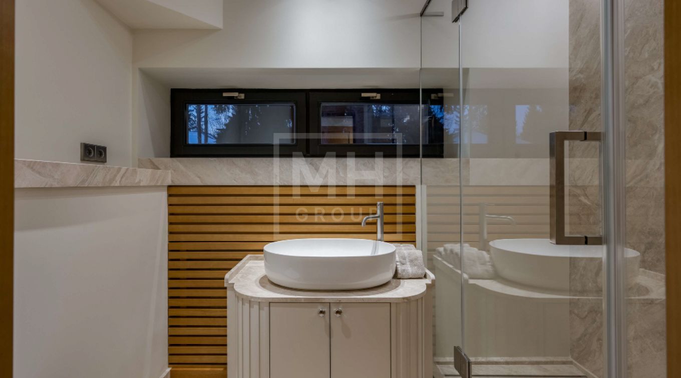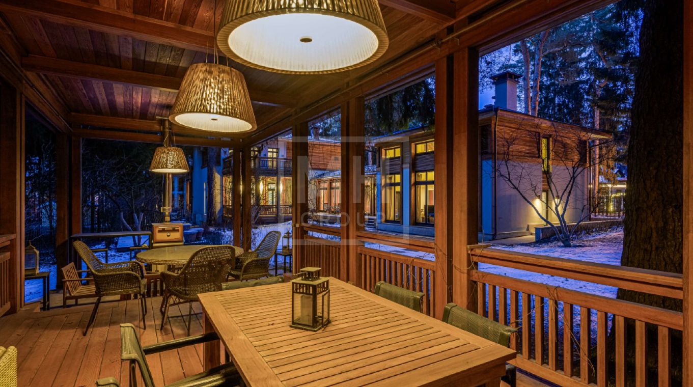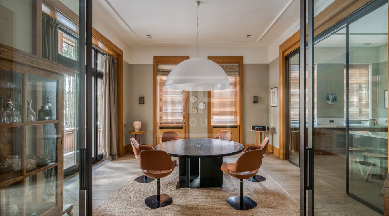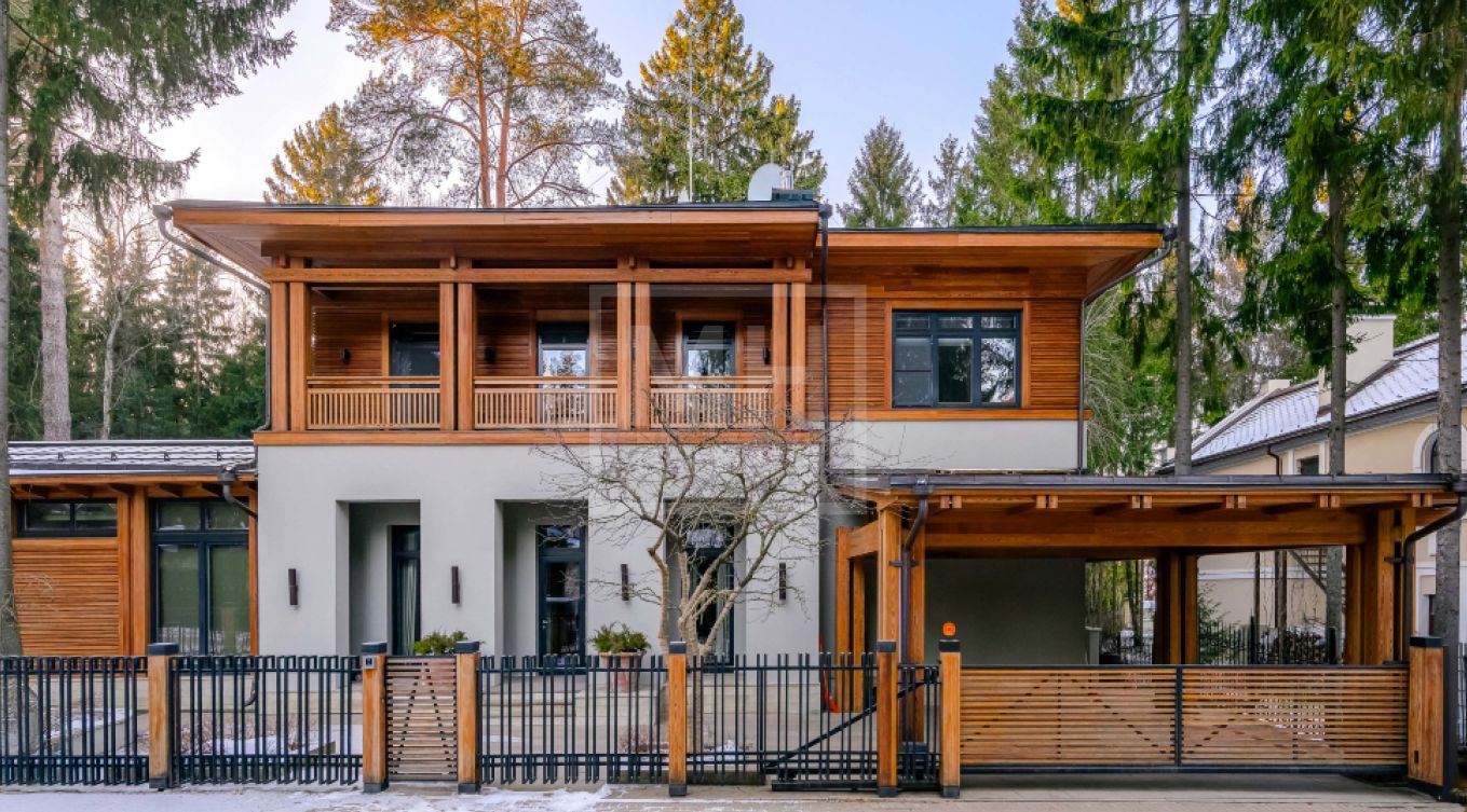 Великолепный дом с бассейном в поселке Шервуд на Новорижском шоссе предлагает идеальный баланс уединения и комфорта.Архитектура дома — авторский проект Федора Арзаманова и бюро «Акант», воплощающий эстетику современного стиля. Комбинированный фасад с применением штукатурки и специально обработанной древесины прекрасно вписывается в естественный природный ланлшафт Высокие потолки и панорамные остекление в доме наполняют пространство светом. В отделке использованы редкие и ценные материалы: мрамор, порфир, красное африканское дерево анегри с глубоким янтарным оттенком. Интерьер выдержан в гармоничном сочетании современного и винтажного дизайна: мебель Gervasoni, кухня Bulthaup, дизайнерские светильники. Продуманная планировка отвечает требованиям комфорта и функциональности. Просторная гостиная с камином и выходом на террасу, объединенная с кухней-столовой, создает идеальное пространство для теплых разговоров в кругу семьи. На втором этаже расположены главная спальня с камином, гардеробной и террасой, а также уютная библиотека, детская гостиная и две детские спальни. SPA- зона включает бассейн с выходом на террасу, сауну, хамам и каминный зал. Для гостей предусмотрены две отдельные спальни с санузлами. В цоколе размещены помещения для персонала, постирочная, фитнес-зона, гардеробная и технические комнаты.