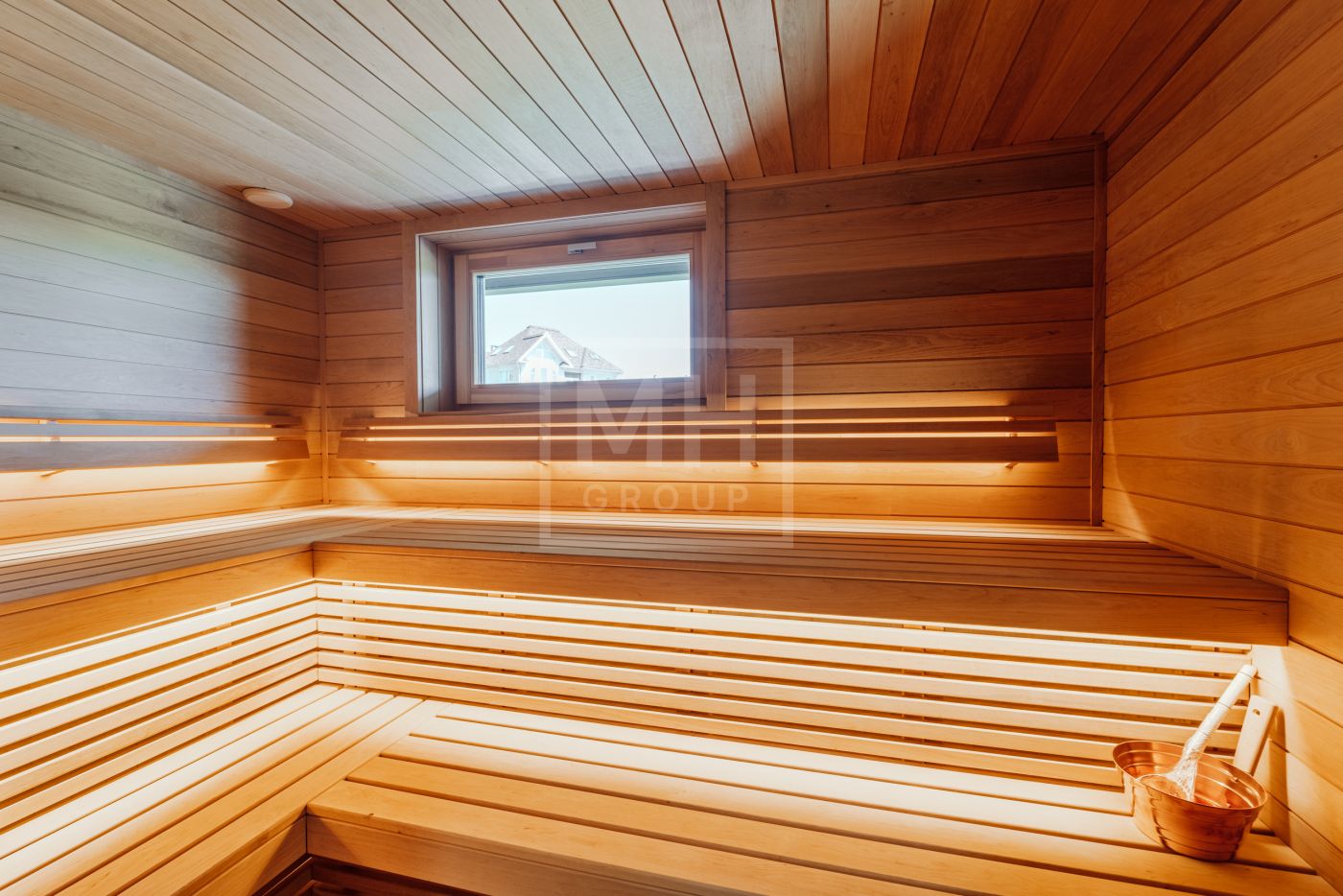 Этаж 1: Прихожая, гардеробная, с/у, гостиная со вторым светом, кухня с выходом на террасу, спальня с с/у и гардеробной, сауна с зоной отдыха