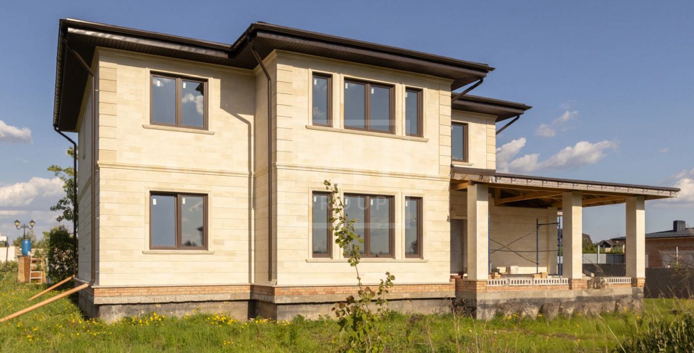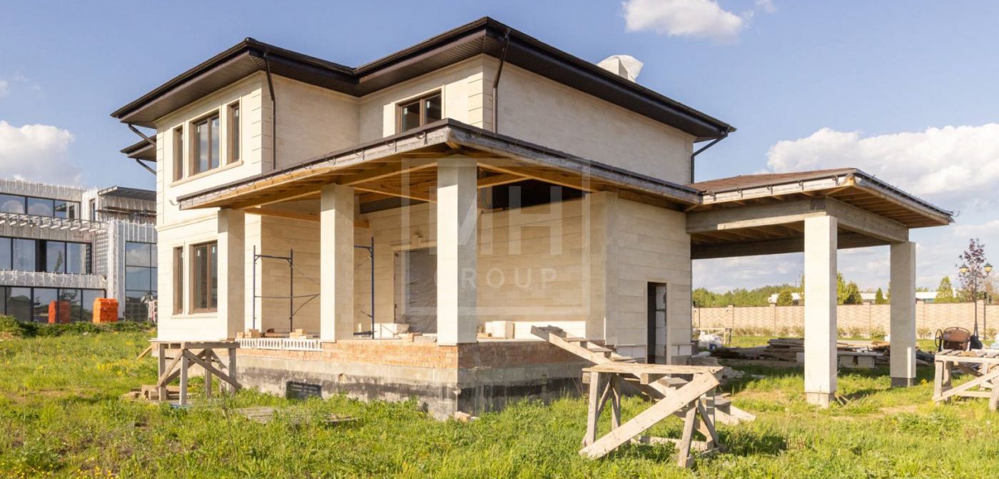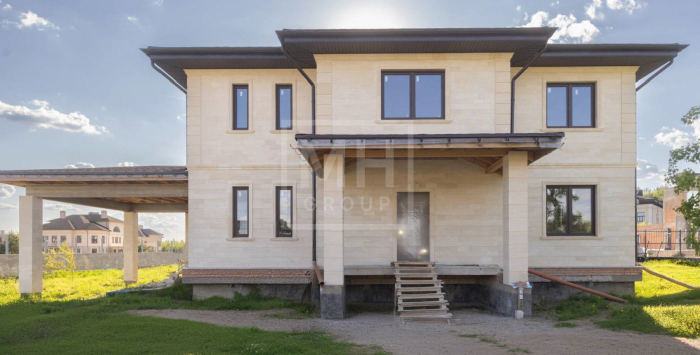 Загородный дом площадью 335 м² расположен на участке 20,5 сотки в тихой части поселка. Фасад здания облицован бежевым песчаником, установлены двухкамерные стеклопакеты Rehau. В коттедже без отделки спланировали 5 спален, гостиную со вторым светом, кухню-столовую, кабинет и просторную террасу. К дому пристроен навес для машины. На участке можно выполнить ландшафтный дизайн и обустроить зону барбекю.