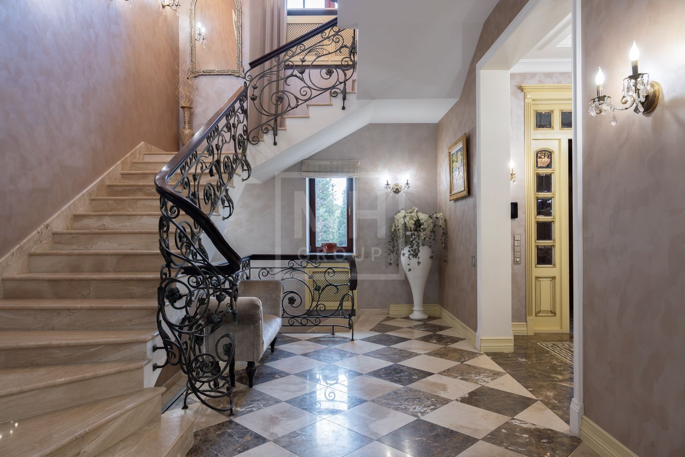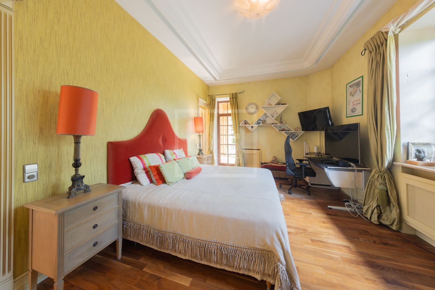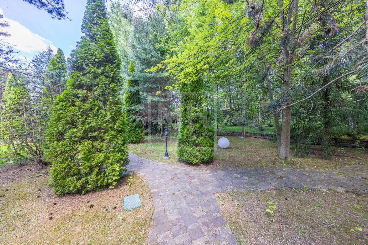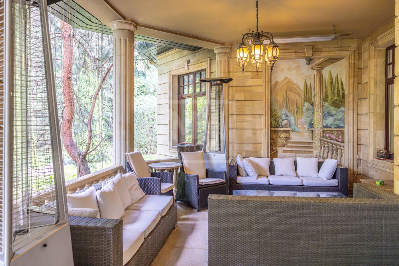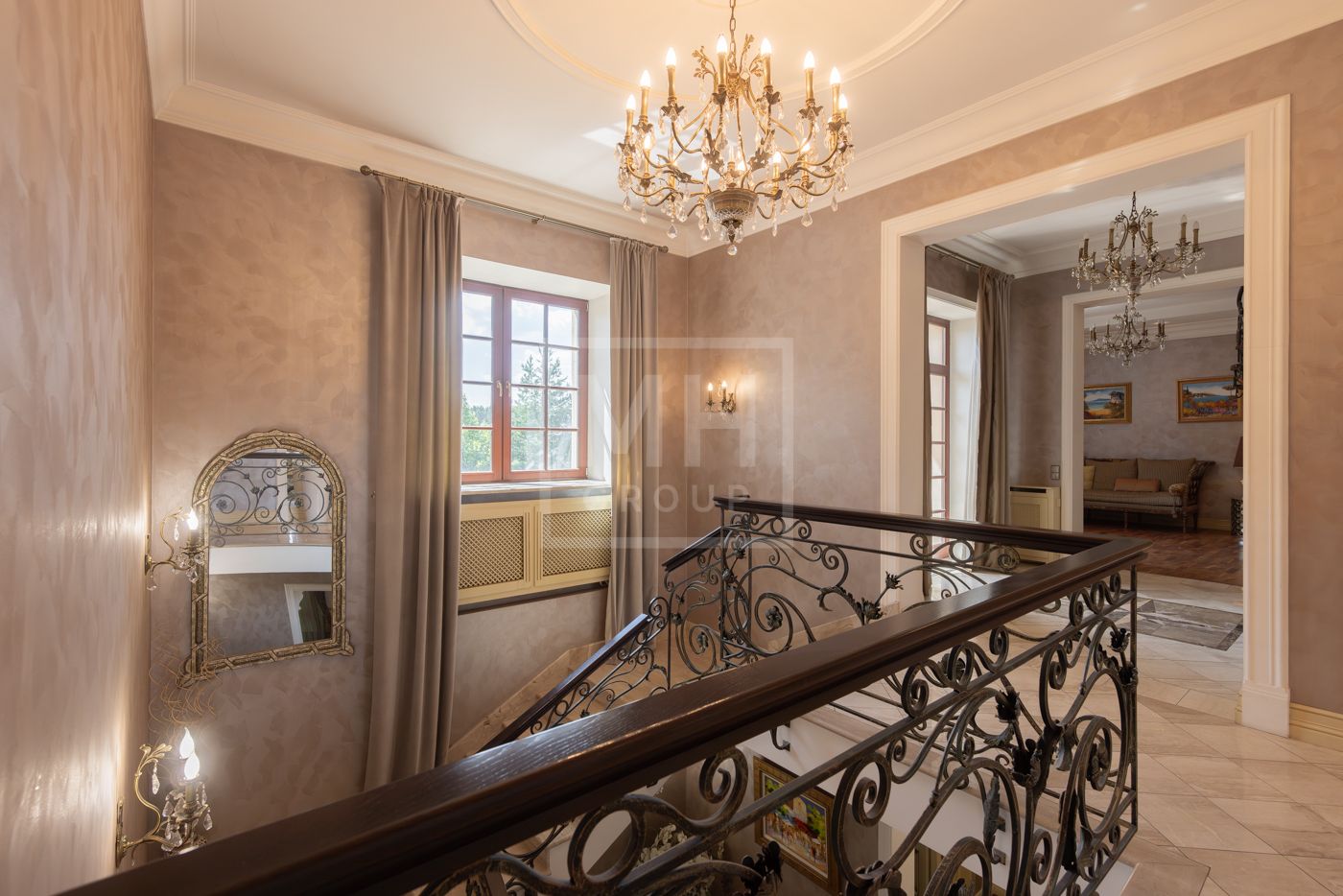 Загородная усадьба в классическом стиле на живописном лесном участке. Прекрасное расположение в самом поселке: в тихой тупиковой улице, рядом выход в охраняемый лесной массив.