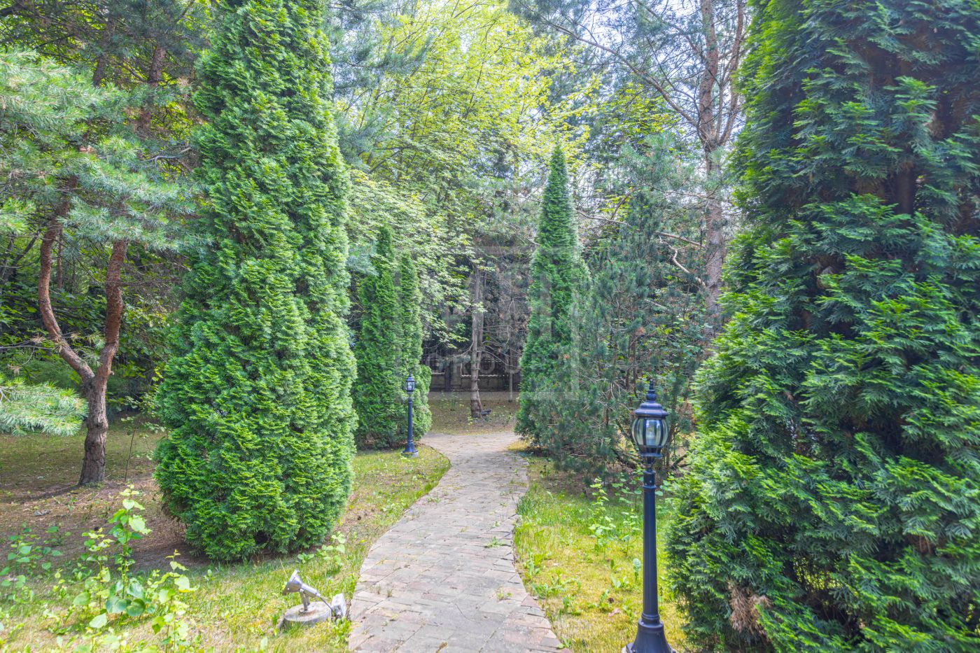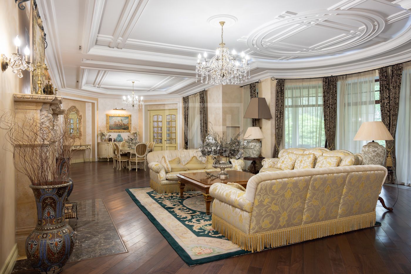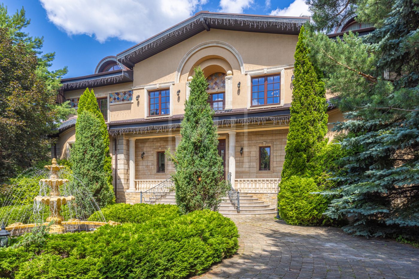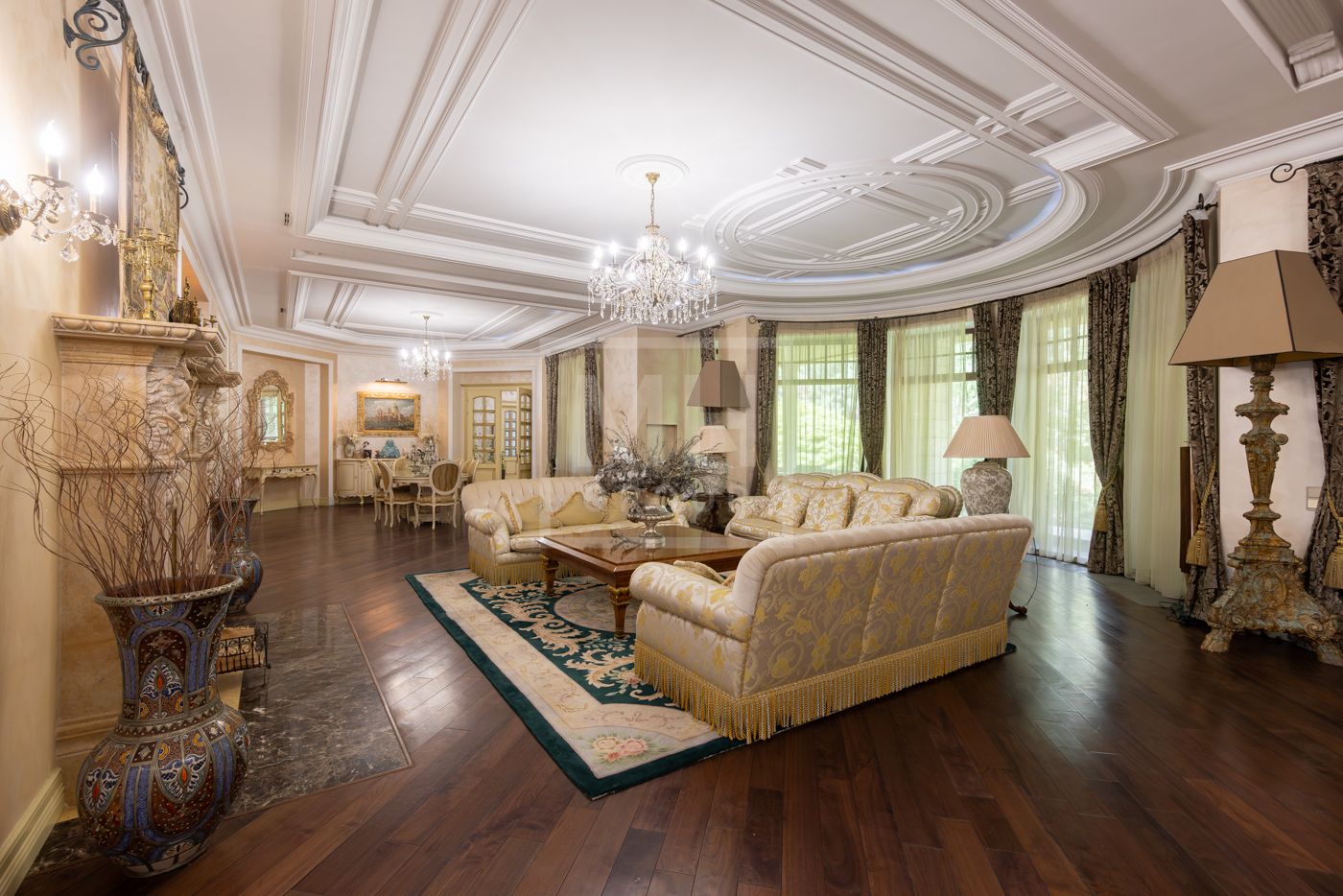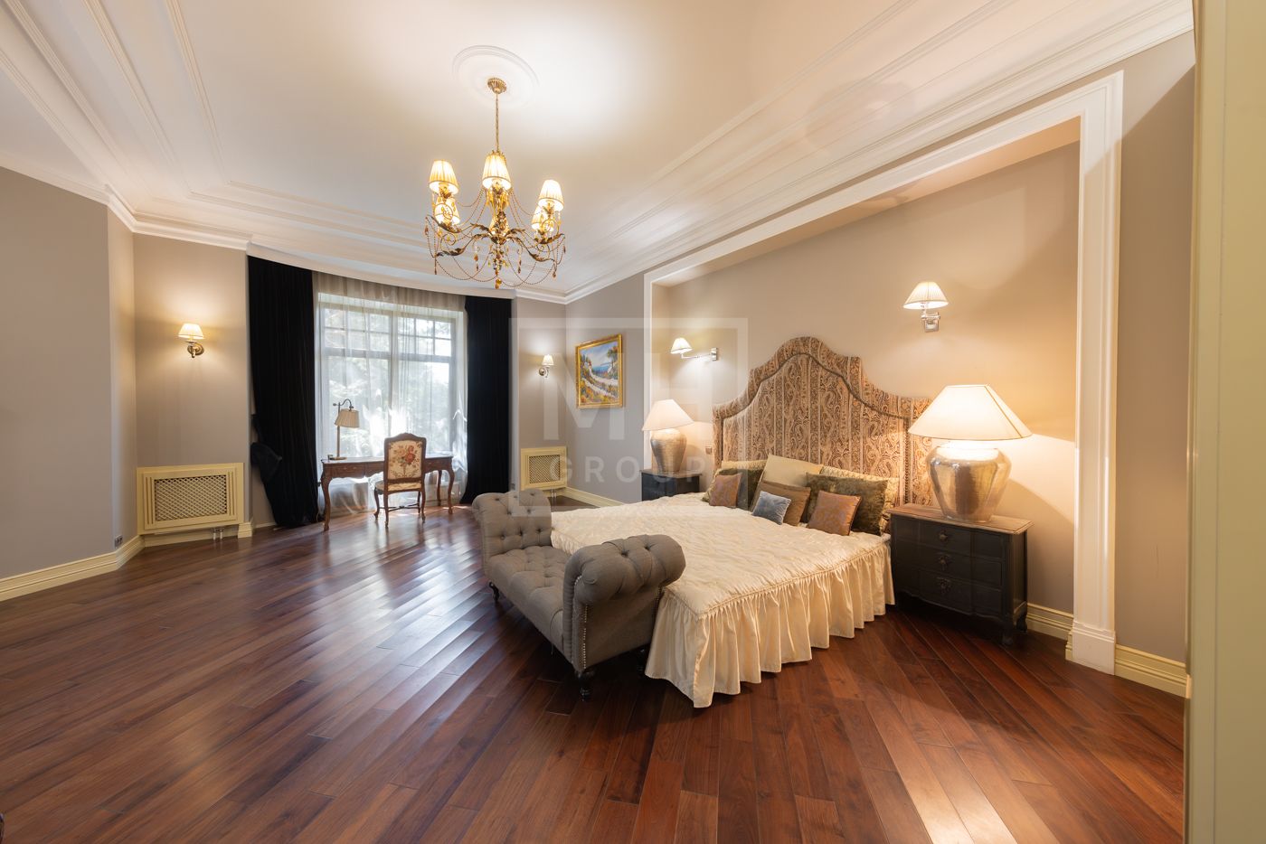 Загородная усадьба в классическом стиле на живописном лесном участке. Прекрасное расположение в самом поселке: в тихой тупиковой улице, рядом выход в охраняемый лесной массив.