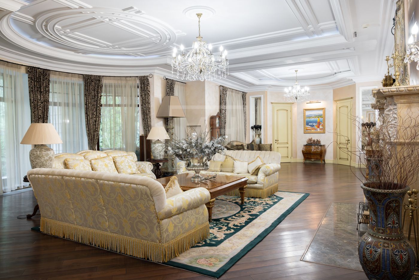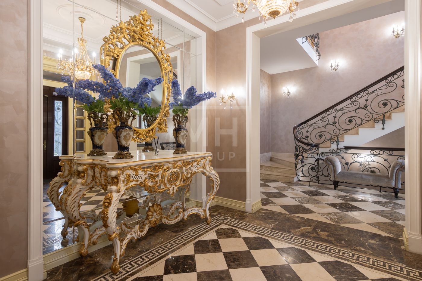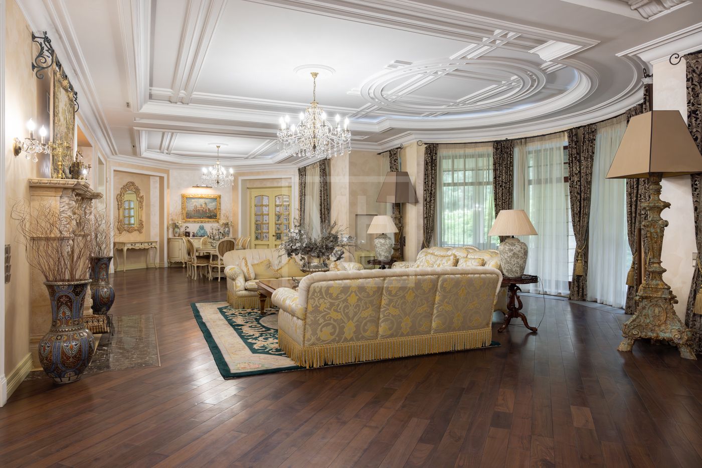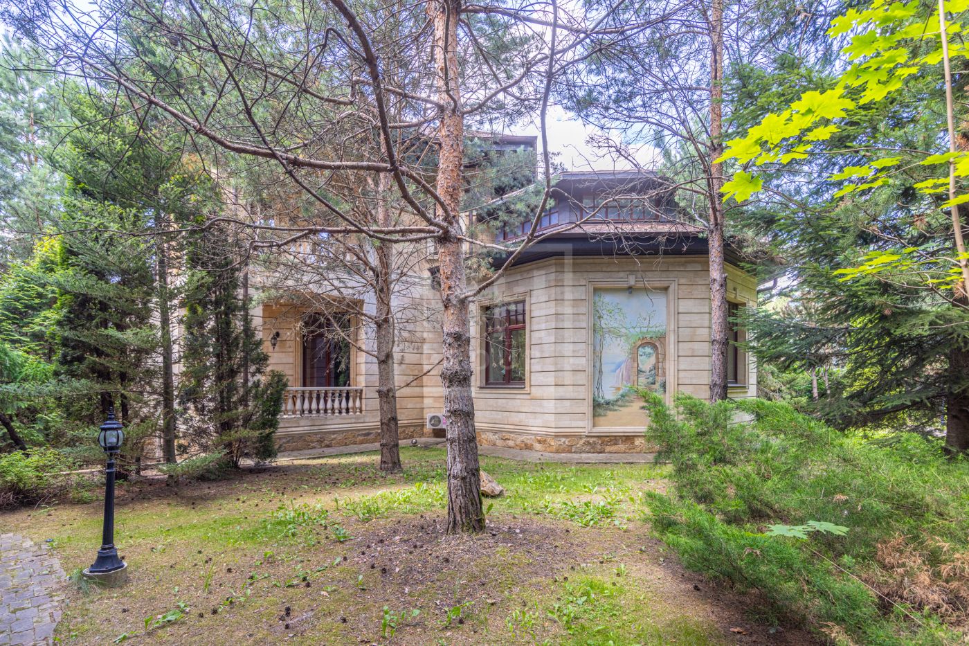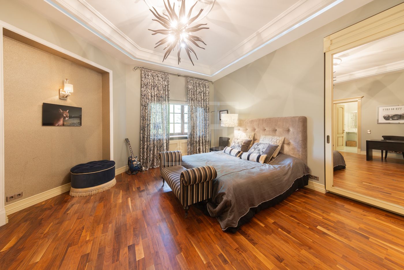 Загородная усадьба в классическом стиле на живописном лесном участке. Прекрасное расположение в самом поселке: в тихой тупиковой улице, рядом выход в охраняемый лесной массив.