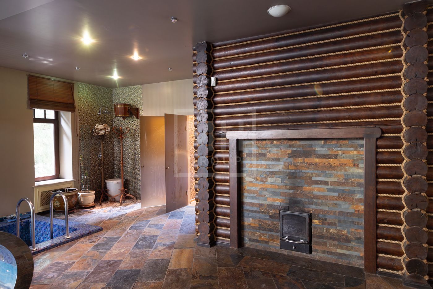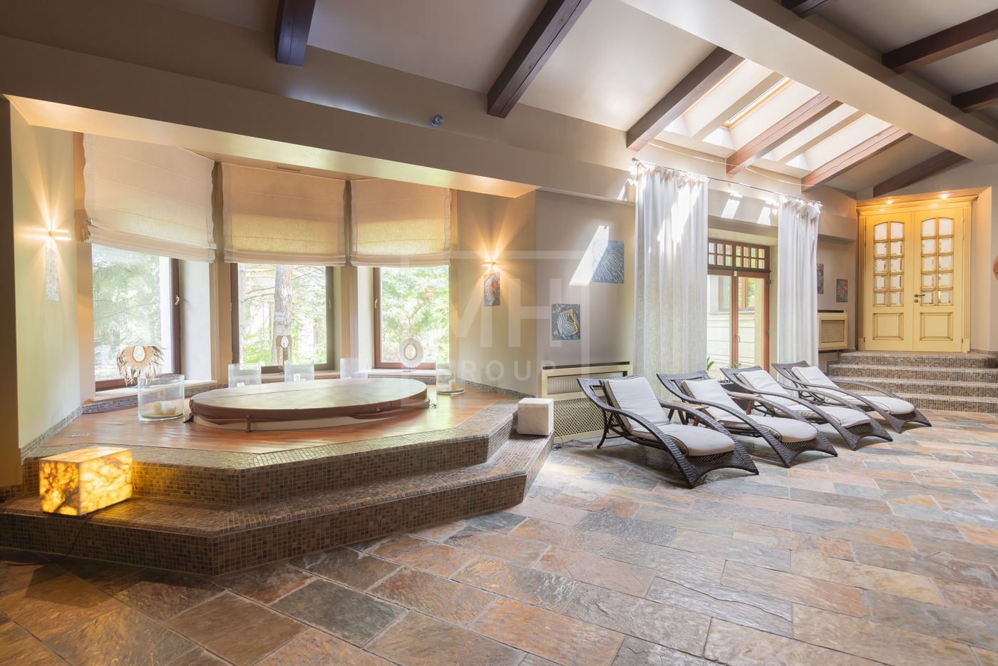 Этаж 1: прихожая, гардеробная, холл, кухня-столовая, кладовая, гостиная, кабинет, зимний сад, с/у, терраса, зона СПА: бассейн, русская баня, душевая, с/у, джакузи, раздевалка, гардеробная.