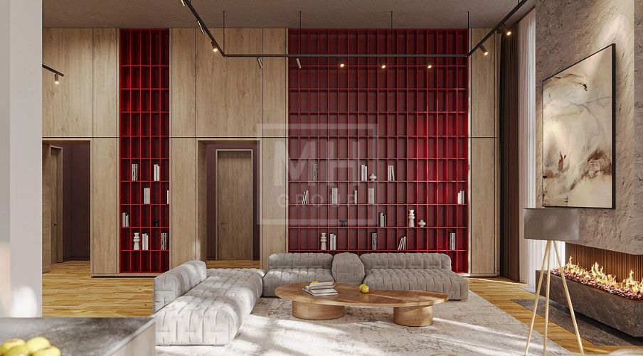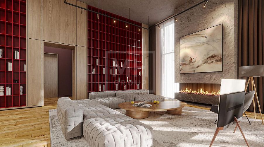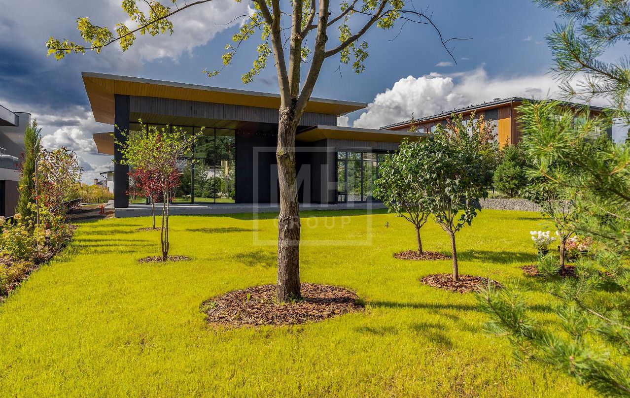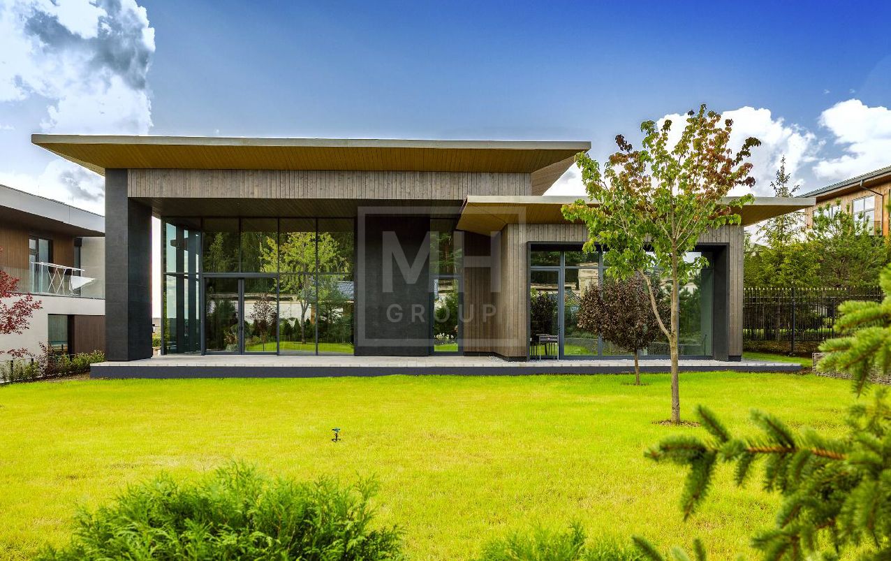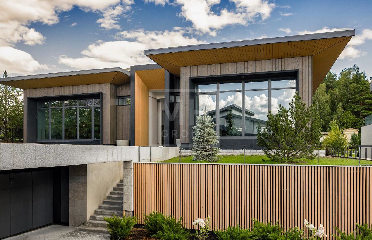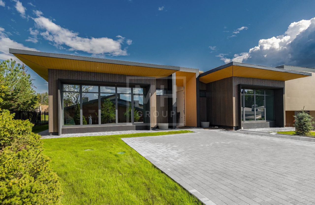 Новый современный дом в стиле современного минимализма в знаковом поселке Ренессанс Парк на Новорижском шоссе. Востребованное архитектурное решение - дом в один этаж с подземным гаражом. Комбинированный фасад из темного натурального камня и специально обработанной древесины. Характерной чертой данного объекта являются потолки с высотой до 5,25 метра, большая площадь остекления, что делает дом невероятно просторным и светлым. Планировкой предусмотрено до 4-х спален. Из просторной зоны кухни-столовой-гостиной есть выход на большую террасу с зоной барбекю, с которой открывается прекрасный вид на прилегающий к поселку лесной массив. На участке выполнен ландшафтный дизайн, высажены декоративные растения и хвойные деревья.
