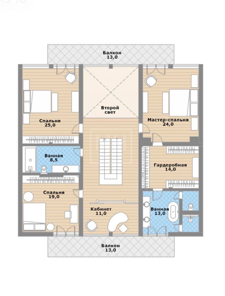 Этаж 2: мастер-спальня с гардеробной и ванной комнатой, 2 детские с ванной комнатой, кабинет с выходом на балкон.