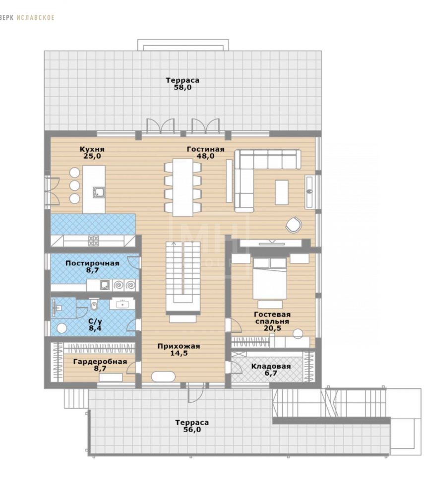 Этаж 1: прихожая с гардеробной, кухня, столовая-гостиная со вторым светом, гостевая спальня, с/у, постирочная, кладовая, террасы.