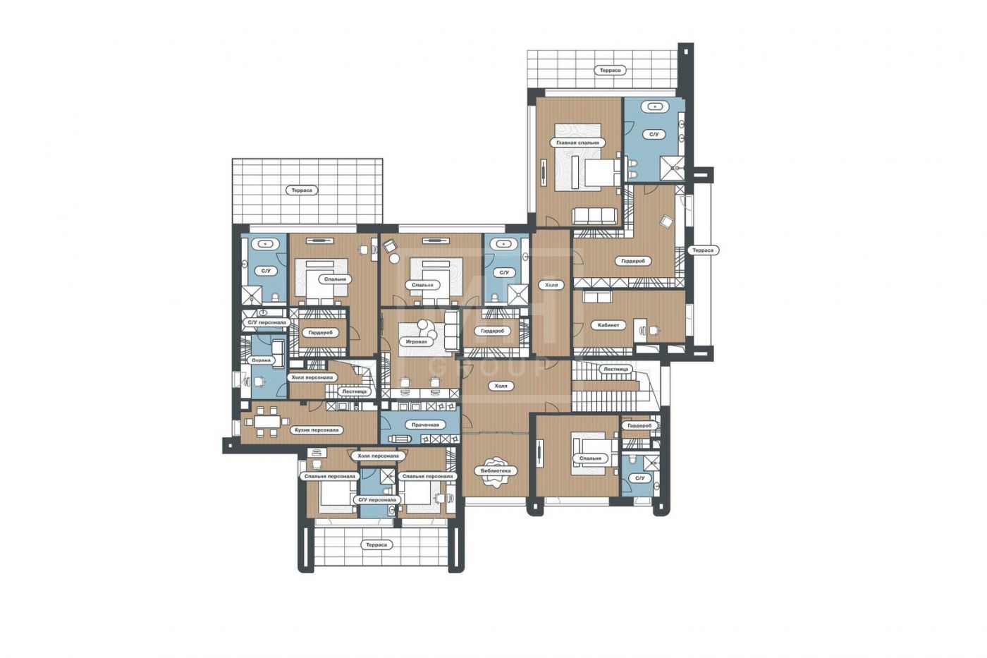 Этаж 2: Холл, мастер - спальня с санузлом и гардеробной, кабинет - 2 шт., спальня с гардеробной и санузлом, терраса - 3 шт., блок для персонала - 2 шт.