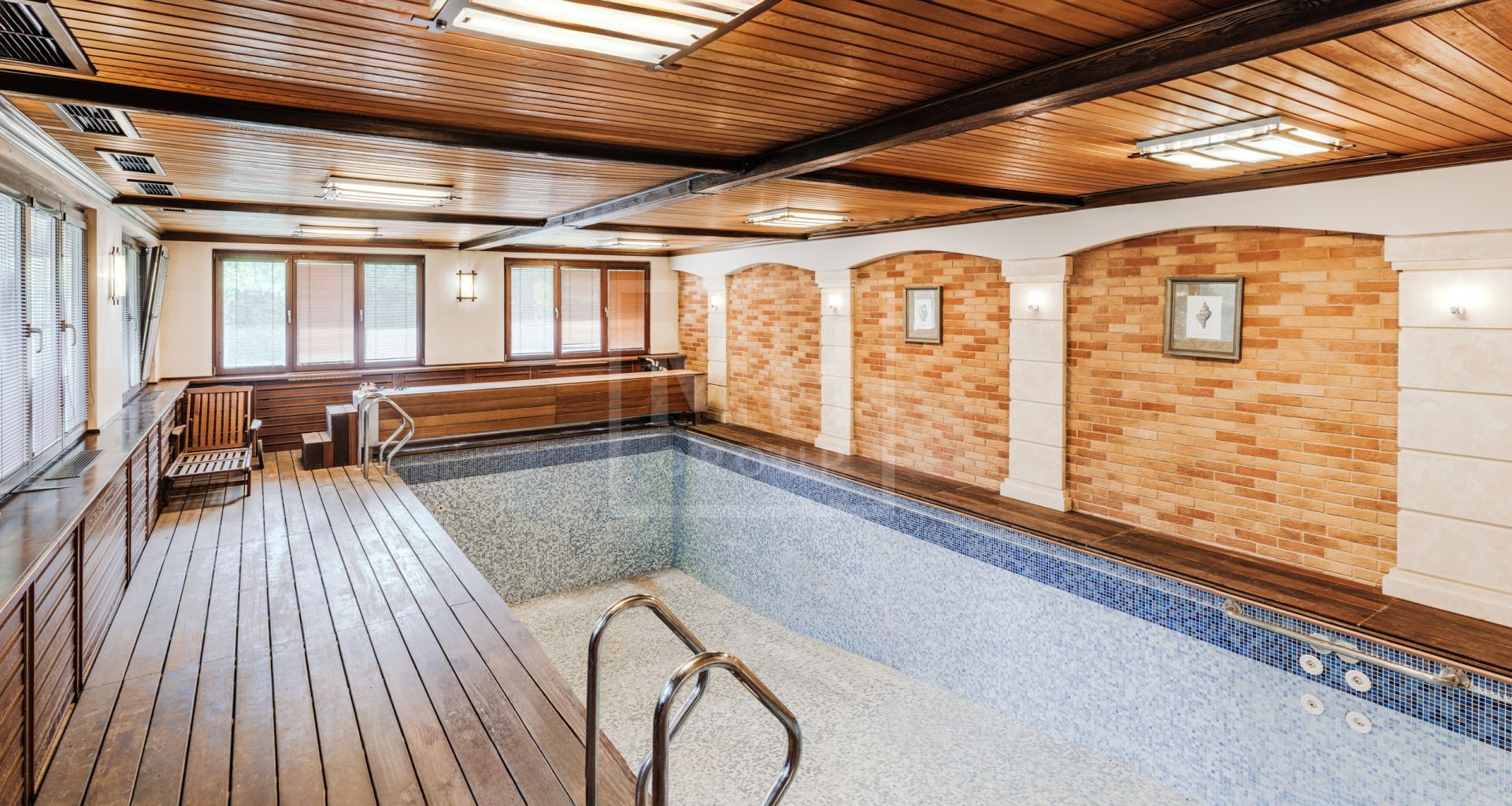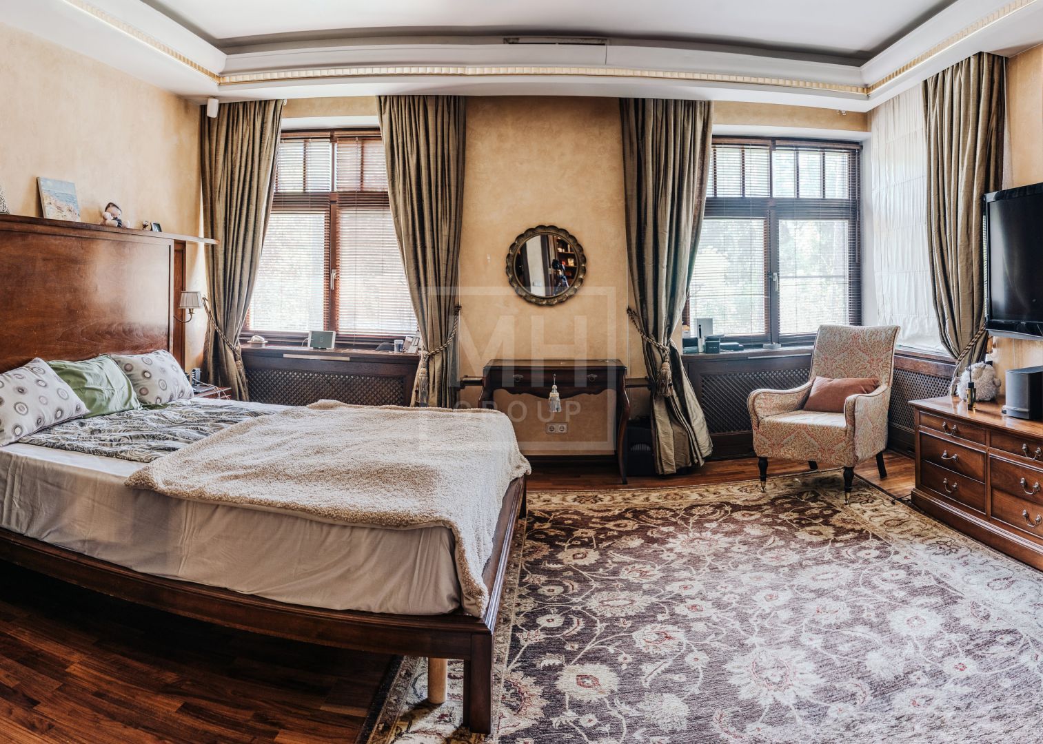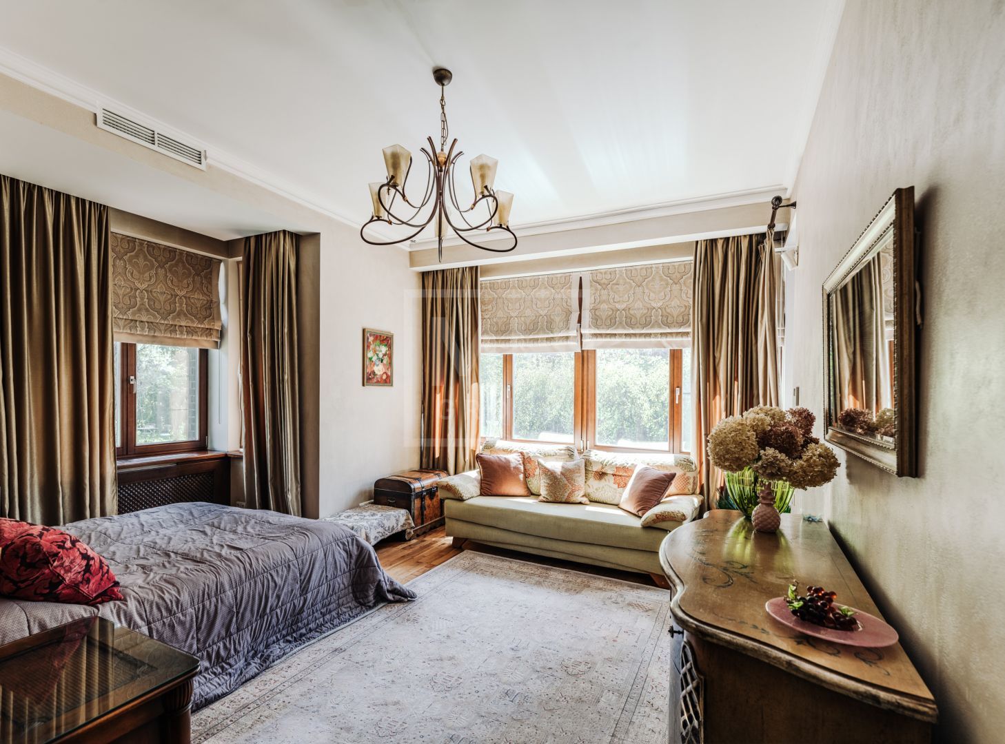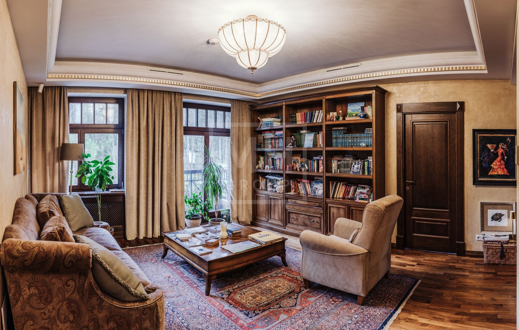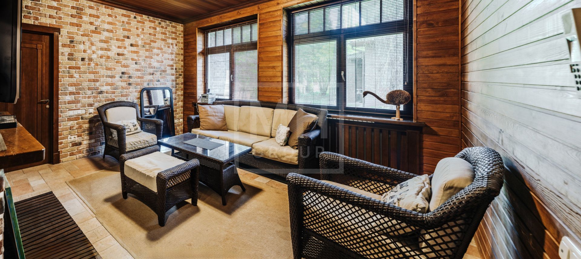 На участке с вековыми корабельными соснами и эксклюзивным ландшафтным дизайном расположен основной дом с гаражом, гостевой дом и отдельно стоящий СПА- комплекс. Респектабельное окружение, тишина. Дом построен из кирпича в архитектурном стиле Ф. Л. Райта, концептуальными особенностями которого являются - приземистость и горизонтальная направленность линий, благодаря которым ощущается единство и гармония с природой. Планировки дома функциональные и комфортные для жизни. Ощущение пространства дарит просторная гостиная с камином и выходом на открытую террасу, предназначенную для семейных посиделок или отдыха с друзьями. Кухня, оборудованная современной техникой и дизайнерской мебелью, граничит с уютной столовой. На первом этаже есть спальня со своим выходом на участок.Широкая лестница, ведущая на второй этаж, имеет комфортный шаг ступеней. Поднявшись на второй этаж мы попадаем в библиотеку с диваном, креслами и выходом на балкон. По обе стороны от библиотеки располагаются спальни: две спальни с с/у и гардеробными, мастер- блок с двумя гардеробными, будуаром, балконом, кабинетом, с/у с ванной и душем. Цокольный этаж предназначен для отдыха, спорта и сезонного хранения вещей. В оформлении дома использованы качественные натуральные материалы, винтажные элементы декора и мебели.В приватной части участка расположен СПА-комплекс, включающий в себя бассейн, просторную парную, купель с душевыми, зону отдыха и полноценную кухню. Во внутренней отделке СПА- зоны использованы натуральное дерево и керамическая мозаика.