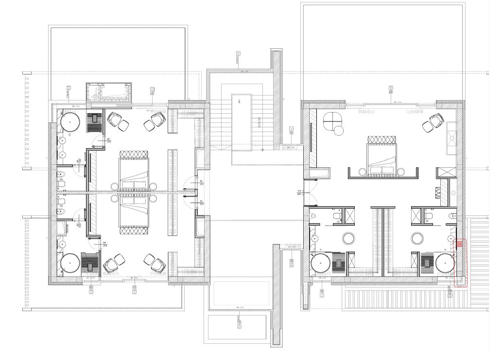 Этаж 2: мастер-спальня с двумя гардеробными и двумя ванными комнатами, 2 спальни, каждая - с гардеробной и с/у.